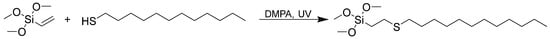 Silane S5 was synthesized by thiol-ene process between vinyltrimethoxysilane and 1-dodecanethiol in the presence of a photoinitiator (2,2-dimethoxy-2-phenylacetophenone, DMPA) and UV light, according to Figure 9.