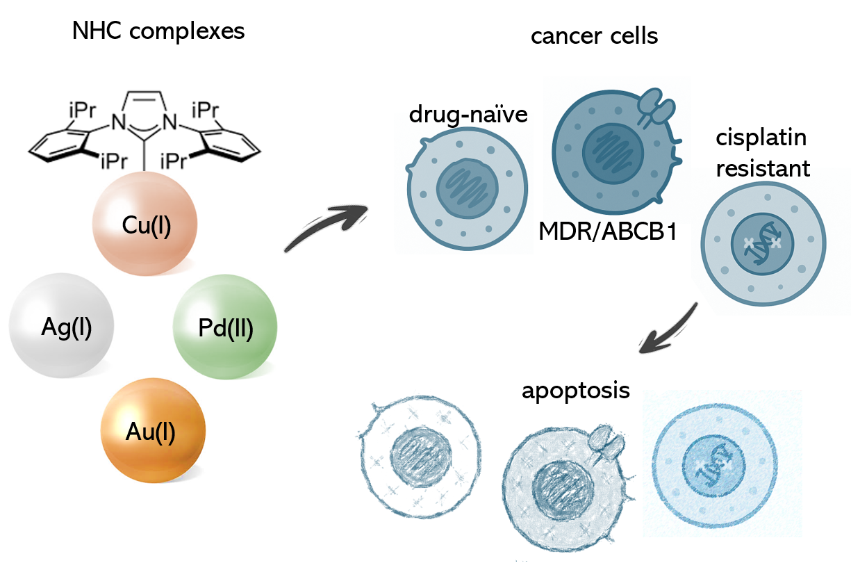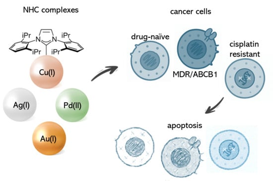 To date, no comprehensive structure–activity relationship has been established regarding the cytotoxicity and resistance profiles of imidazolinium-based NHC-metal complexes. In this study, we synthesized imidazolinium and imidazolium complexes with copper(I), silver(I), gold(I) and palladium(II) centers to investigate their anticancer activity against both parental and drug-resistant cell lines. These metals—especially gold(I) and silver(I)—are among the most frequently investigated centers for NHC complexes, not only for classical imidazolium-type ligands but also for broader NHC classes such as benzimidazoles and triazoles [