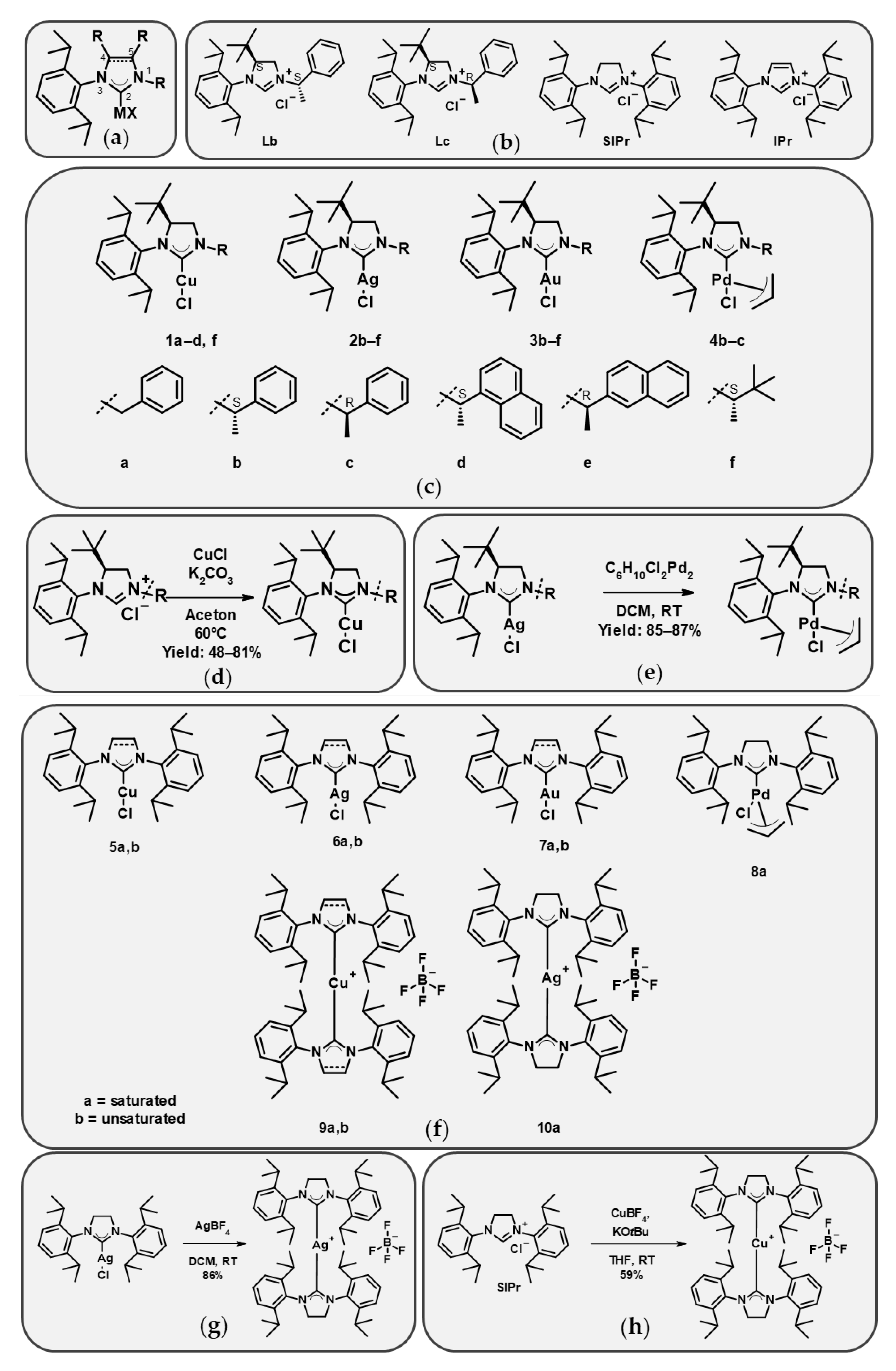 Figure 1a compiles the set of imidazolium and imidazolinium salts that were used as carbene precursors and the derived metal complexes. Some of the NHC precursors are commercially available (