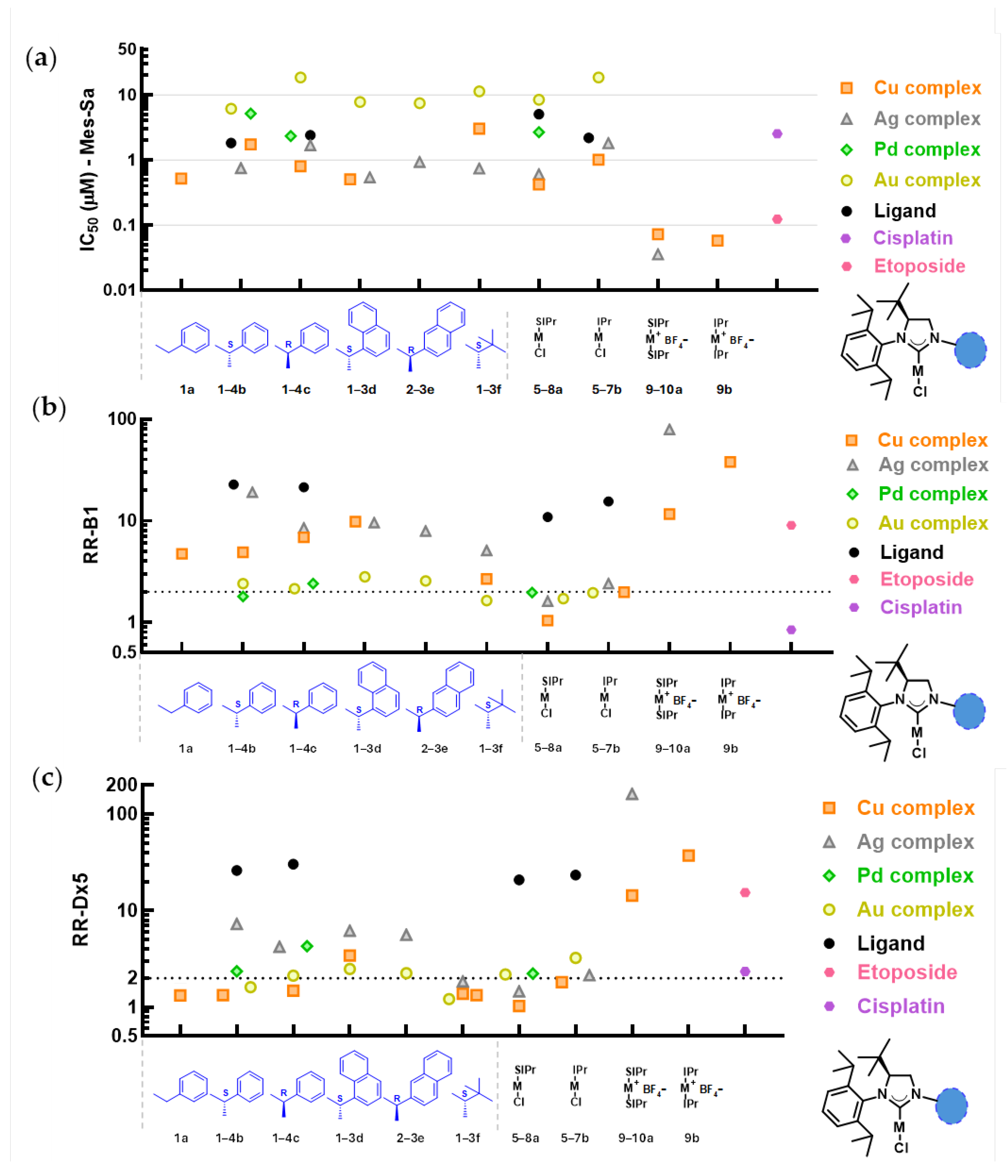 IPr). Despite the higher ABCB1 expression levels, the resistance of Mes-Sa/Dx5 against monocarbene copper complexes was marginal (RR: 1.0–3.4); against silver complexes, resistance was low to moderate (RR: 1.5–7.3); and against gold complexes, resistance was low to marginal (RR: 1.2–3.2); and lastly, against palladium complexes, we observed 2.2–4.3-fold resistance. Against the biscarbene complexes of copper, the RR values of Mes-Sa/Dx5 were 14.3 and 37.3 for