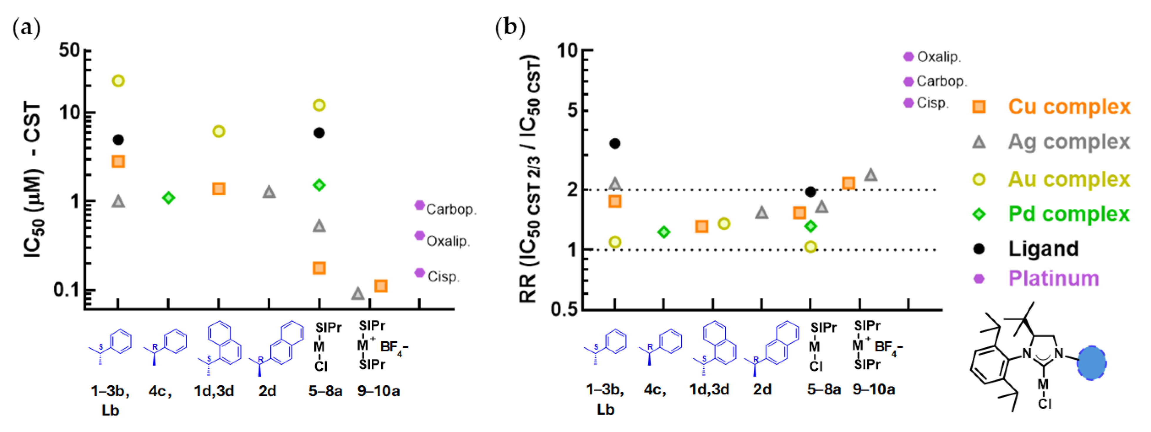 Table S3). Similarly to the results obtained with the parental Mes-Sa line, monocarbene copper and silver complexes were more cytotoxic against parental CST (0.18–2.81 µM and 0.53–1.28 µM, respectively) than the free ligands