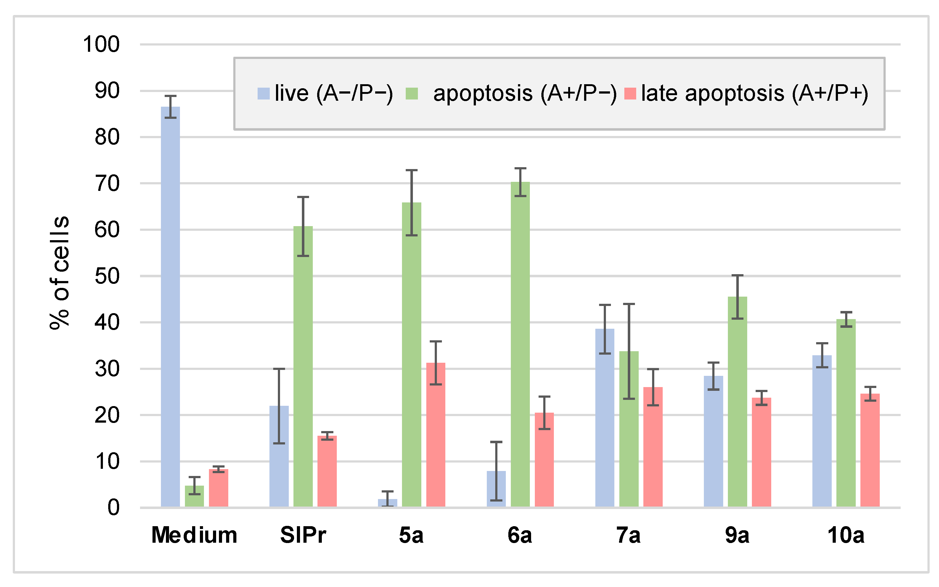 10a, however, possessed stronger, 6.1–15.7-fold selectivity against the cancer cells that exceeded the selectivity of cisplatin against Mes-Sa (6.8-fold). Against CST, cisplatin selectivity was 113.6-fold compared to MSCL-1, which accounted for the loss of BRCA1 function of this cancer line, making it hypersensitive to DNA-damaging agents. The selectivity of the free SIPR ligand against Mes-Sa and CST was 2.3- and 2.0-fold, respectively.