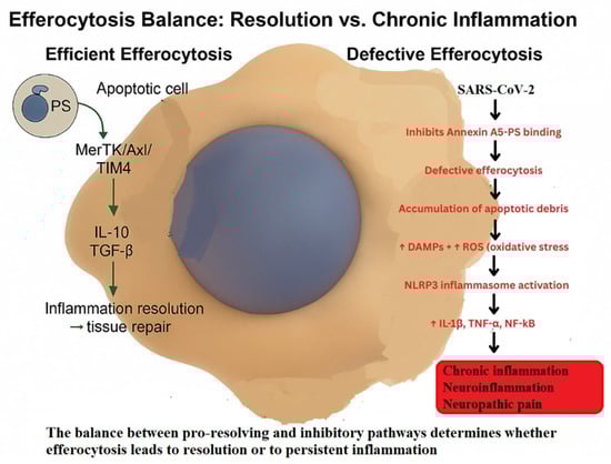 Schematic representation of the transition from efficient to defective efferocytosis. Under physiological conditions, MerTK–Axl–TIM-4 signaling promotes IL-10 and TGF-β production, driving anti-inflammatory reprogramming, inflammation resolution, and tissue repair. In pathological contexts such as SARS-CoV-2 infection, inhibition of Annexin A5–phosphatidylserine binding impairs efferocytosis, leading to apoptotic debris accumulation, oxidative stress (↑ROS), DAMP release, and NLRP3 inflammasome activation. These processes sustain IL-1β, TNF-α, and NF-κB signaling, resulting in chronic inflammation, neuroinflammation, and NP [,,,,,].