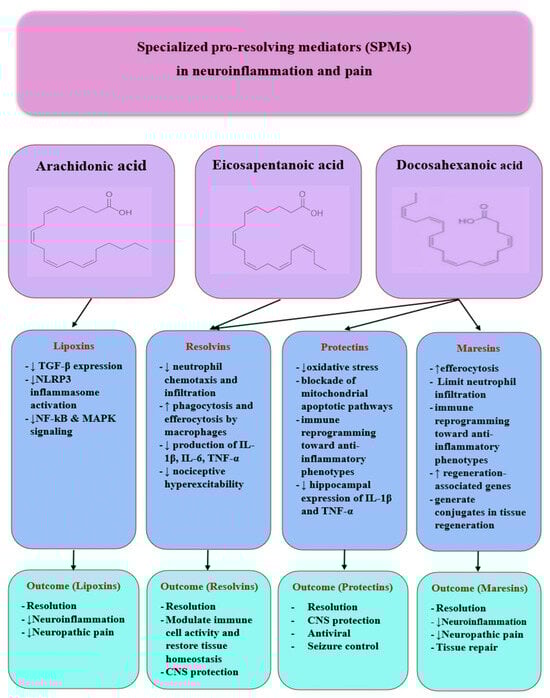 SPMs in neuroinflammation and pain. Specialized pro-resolving mediators (SPMs)—lipoxins, resolvins, protectins, and maresins—derived from AA, EPA, and DHA regulate neuroinflammation by downregulating pro-inflammatory pathways, modulating glial responses, and promoting neuronal protection and tissue repair, ultimately contributing to pain resolution.