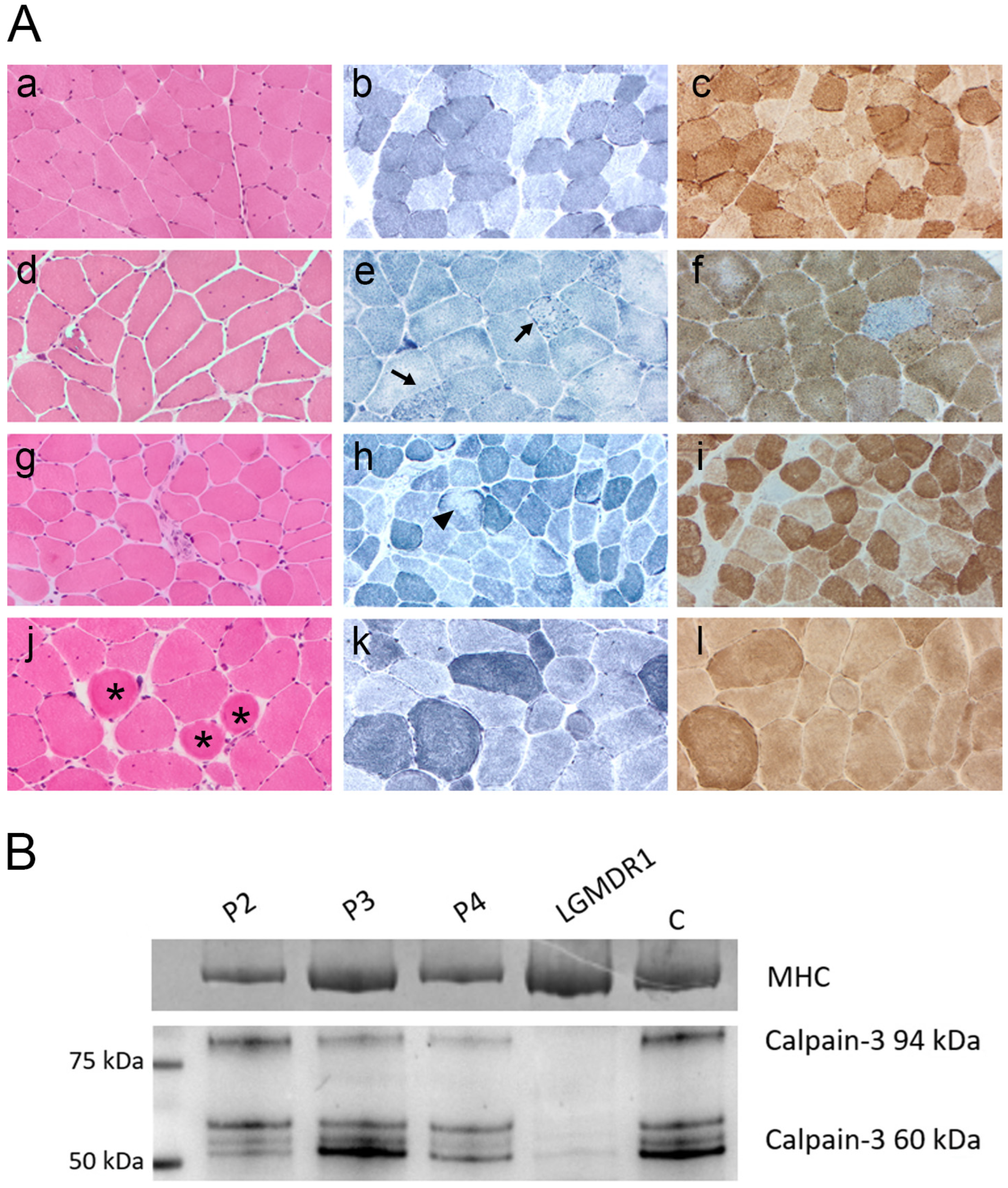 - Vissing, J.; Dahlqvist, J.R.; Roudaut, C.; Poupiot, J.; Richard, I.; Duno, M.; Krag, T. A single c.1715G>C calpain 3 gene variant causes dominant calpainopathy with loss of calpain 3 expression and activity. Hum. Mutat. 2020, 41, 1507–1513. [Google Scholar] [CrossRef]