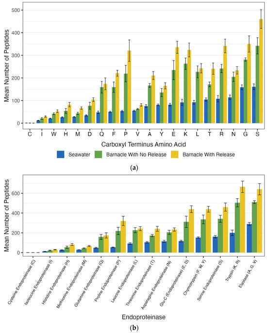 Barnacle treatments exhibited between 2.22 and 2.79-fold more peptide generation than seawater samples (Figure 2). The most frequent carboxyl terminus amino acids in the generated peptides from barnacles that released larvae were serine (460 ± 137 peptides), glycine (350 ± 120 peptides), and arginine (342 ± 101 peptides). The barnacles that did not release larvae had the highest number of peptides with carboxyl terminus amino acids of serine (342 ± 72 peptides), glycine (281 ± 15 peptides), and lysine (263 ± 50 peptides).