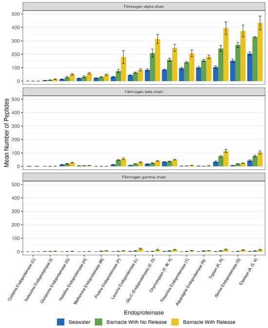 The highest number of peptides were generated from the fibrinogen alpha chain across both the barnacle and seawater samples (Figure 3). The next highest number of peptides were generated by the three casein protein subunits (alpha-S1-casein, alpha-S2-casein, and beta-casein (See Supplementary Figure S1)). The fibrinogen alpha chain generated over five times the number of peptides generated by the fibrinogen beta chain and over twenty-seven times the number of peptides generated by the fibrinogen gamma chain.