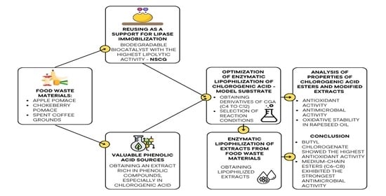 Addressing global food waste challenges, this study investigated plant-based byproducts, spent coffee grounds, apple, and chokeberry pomaces, as sources of phenolic acids and biodegradable carriers for lipase immobilization. The goal was to enhance the lipophilicity and functionality of natural phenolics by enzymatic lipophilization. Microbial lipase from A. oryzae was immobilized on these materials, with native spent coffee grounds (NSCG) showing the highest activity (6.0 U/g hydrolytic; 1036 U/g synthetic). Chlorogenic acid (CGA), predominant in extracts, served as a model substrate. Using response-surface methodology, optimal conditions for butyl-CGA synthesis were determined. This is the first report of CGA lipophilization using food-waste-immobilized biocatalysts, where reaction yield for NSCG increased with alcohol chain length, peaking with dodecanol (34.06%). Among synthesized esters, butyl chlorogenate displayed the highest antioxidant activity, comparable to free CGA and BHT, and increased lipophilicity, though a “cut-off” effect appeared for longer chains. Medium-chain esters (C6, C8) showed selective antimicrobial activity against Gram-positive bacteria. While lipophilization of chokeberry pomace and spent coffee grounds extracts reduced antioxidant activity, short-chain esters (C4–C6) improved rapeseed oil stability. The findings highlight food waste as a sustainable source for developing biocatalysts and value-added bioactives with enhanced functional properties.