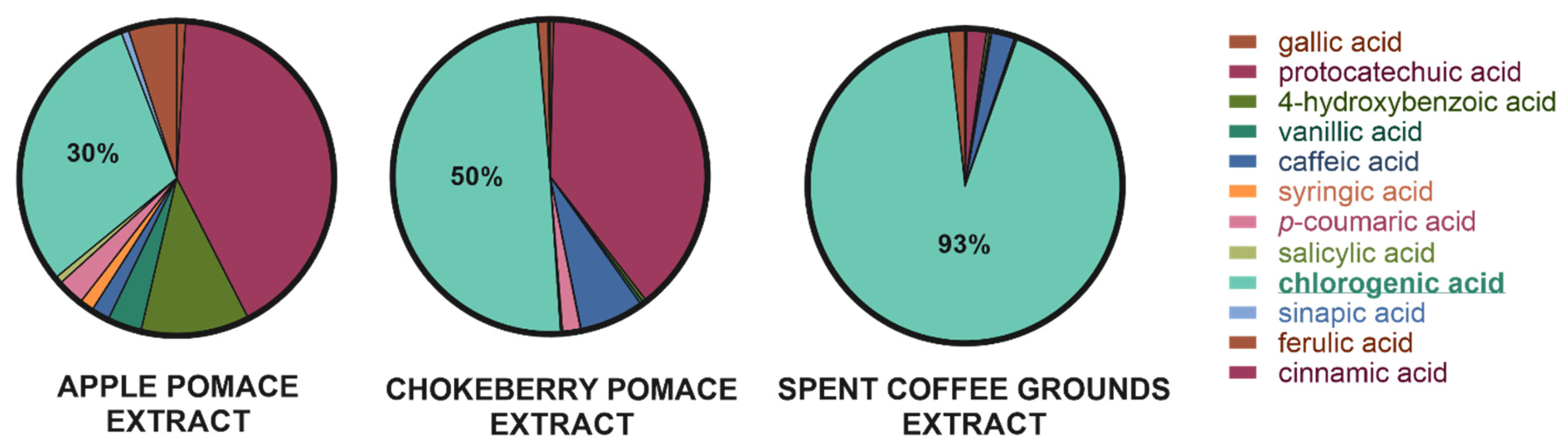 Lyophilized dry extracts obtained from spent coffee grounds, chokeberry pomace, and apple pomace were analyzed for their content of selected phenolic acids using LC-MS (Figure 2). The analysis included the following compounds: gallic acid, protocatechuic acid, 4-hydroxybenzoic acid, vanillic acid, caffeic acid, syringic acid, p-coumaric acid, salicylic acid, chlorogenic acid, sinapic acid, ferulic acid, and cinnamic acid. Among the tested samples, the extract derived from spent coffee grounds exhibited the highest dominance of a single compound, with chlorogenic acid accounting for approximately 93% of the total identified phenolic acids. The remaining 7% consisted primarily of protocatechuic, caffeic, and ferulic acids. In the chokeberry pomace extract, chlorogenic acid also represented a significant portion, accounting for approximately 50% of the total phenolic acid content. Protocatechuic and caffeic acids were the next most abundant compounds. The extract from apple pomace displayed a more diverse phenolic profile. In this case, protocatechuic acid was the most prevalent (42%), while chlorogenic acid accounted for approximately 30% of the total, followed by 4-hydroxybenzoic acid as the third most abundant component. Based on the obtained results, chlorogenic acid was selected as a model substrate for further investigations, due to its presence in all three extracts and its relatively high proportion in each sample.