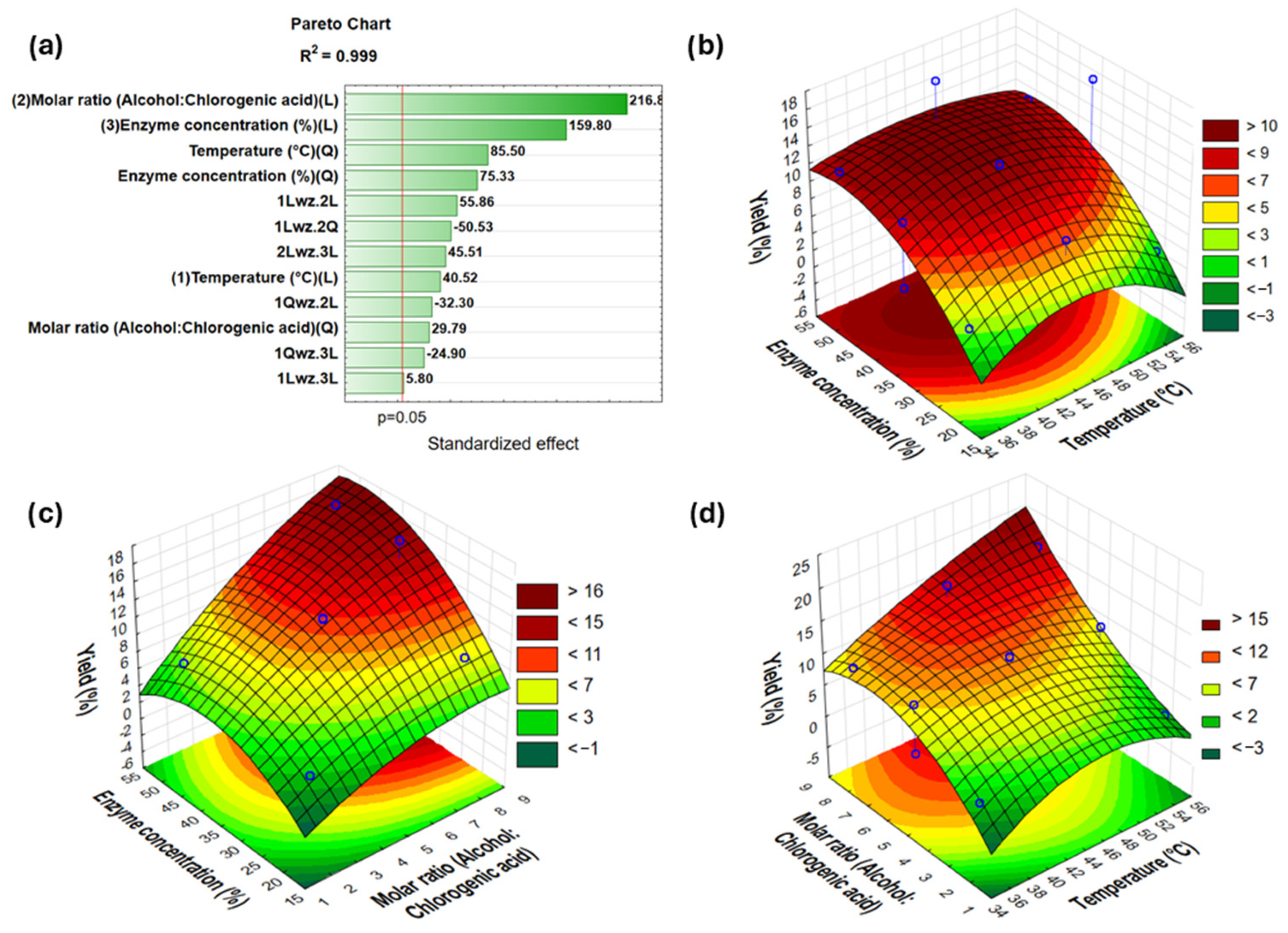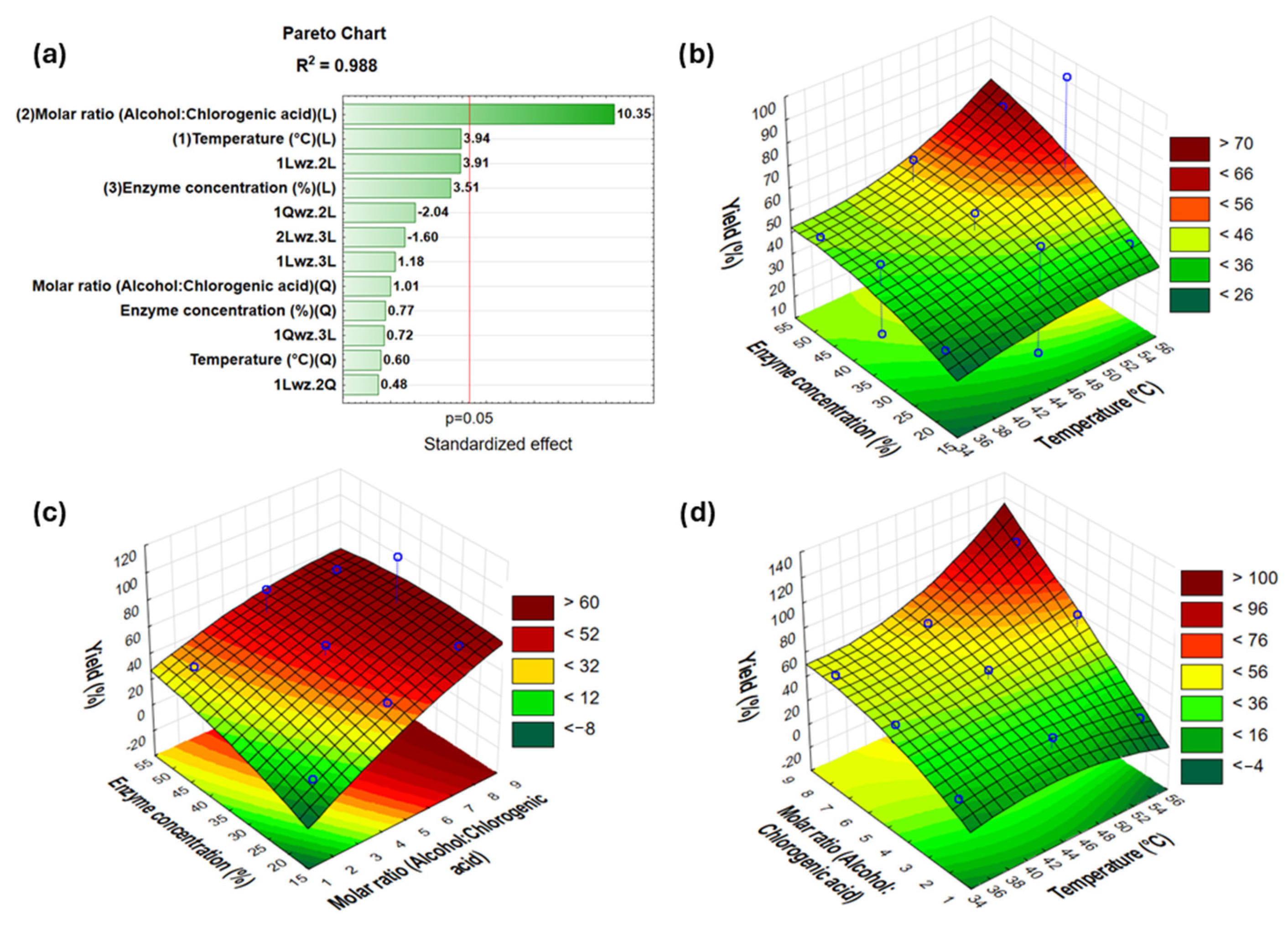 In the current study, a response surface methodology was utilized to optimize the enzymatic synthesis of butyl chlorogenate via the direct esterification of chlorogenic acid with 1-butanol using NSCG as a biocatalyst and Novozym 435 as a reference. A total of 15 runs (Table 2) were conducted to evaluate different temperatures (35–55 °C), substrate molar ratios (alcohol to chlorogenic acid—2:1, 5:1, and 8:1), and enzyme concentration (20–50%). The results, presented in the form of a Pareto chart and 3D response surface plots, are shown in Figure 3 and Figure 4. The response model evaluated in this study had a coefficient of determination (R2) equal to 0.999 and an adjusted R2 = 0.999 for reaction catalyzed by NSCG and an R2 of 0.988 and an adjusted R2 = 0.913 for Novozym 435, with a 95% confidence level.
