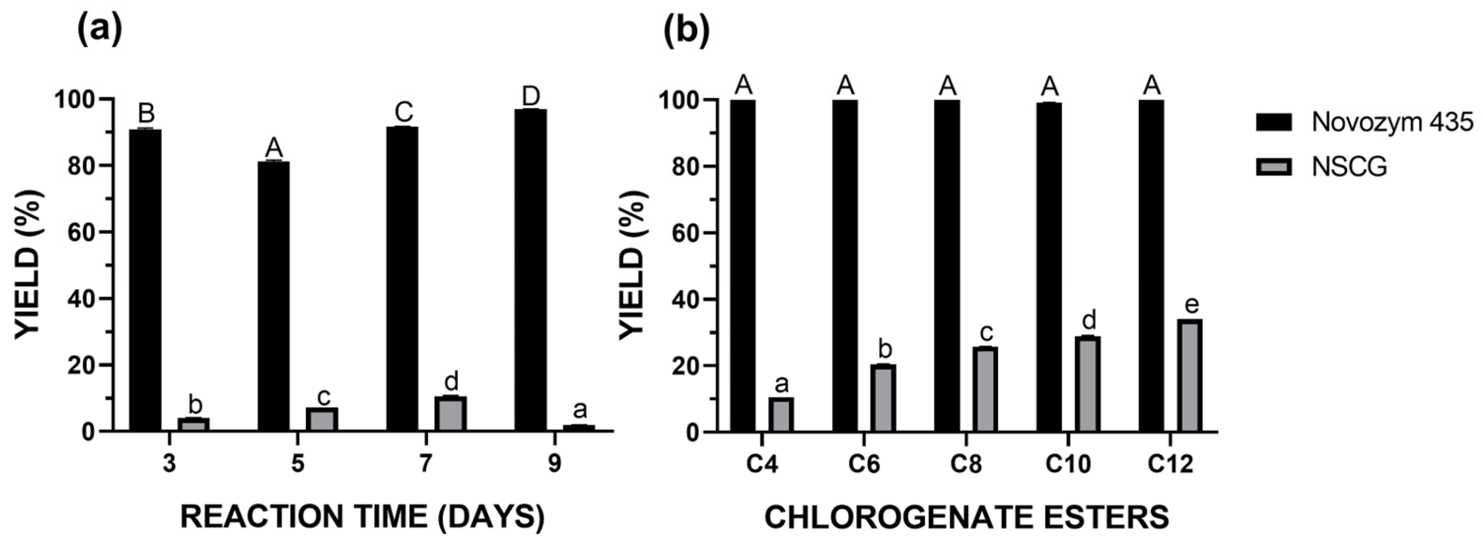 Despite the widespread use of immobilized commercial lipases in these studies, a significant gap remains concerning the employment of environmentally sustainable biocatalysts. To date, no reports have investigated the enzymatic lipophilization of chlorogenic acid using enzymes immobilized on biodegradable, waste-derived supports such as spent coffee grounds. This study addresses this gap by assessing the catalytic performance of a novel NSCG biocatalyst and comparing it with a commercial reference, thereby offering new insights into developing greener, cost-effective alternatives for modifying phenolic compounds. It is the first study of its kind to use microbial lipase immobilized by adsorption on spent coffee grounds to derivatize chlorogenic acid contained in food waste extract. Until now, this type of biocatalyst has only been utilized for the hydrolysis of milk fat. The immobilized lipase from Candida rugosa onto spent coffee grounds was used to hydrolyze bovine milk to evaluate operational stability within a real sample. This solid biocatalyst yielded nearly 60% conversion of milk fats into fatty acids after 18 h of reaction, maintaining this level across three reuses [37]. An attempt was also made to immobilize lipase from Thermomyces lanuginosus (TLL) onto spent coffee grounds, but during the research, it was found that it did not display any enzymatic activity and was not chosen to catalyze the synthesis of hexyl laurate [24].