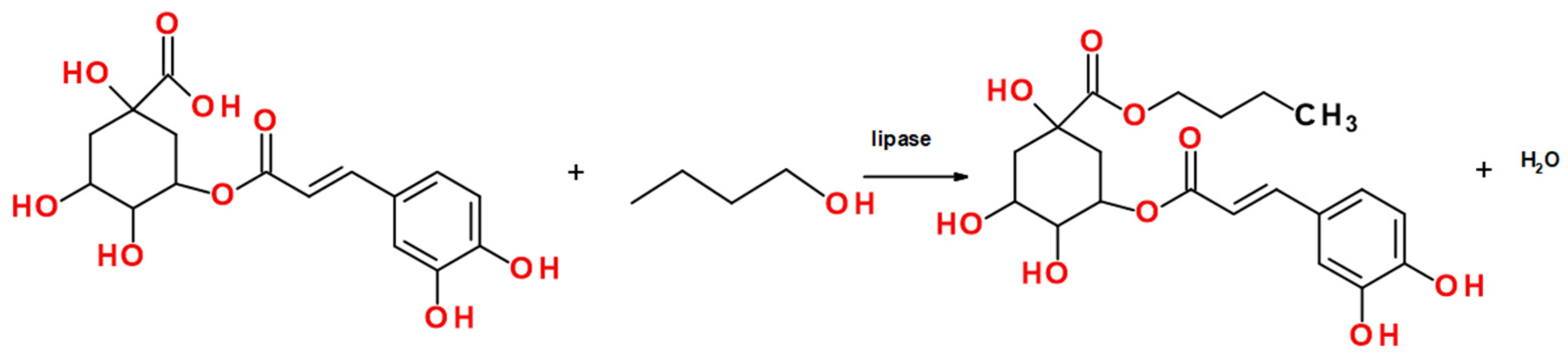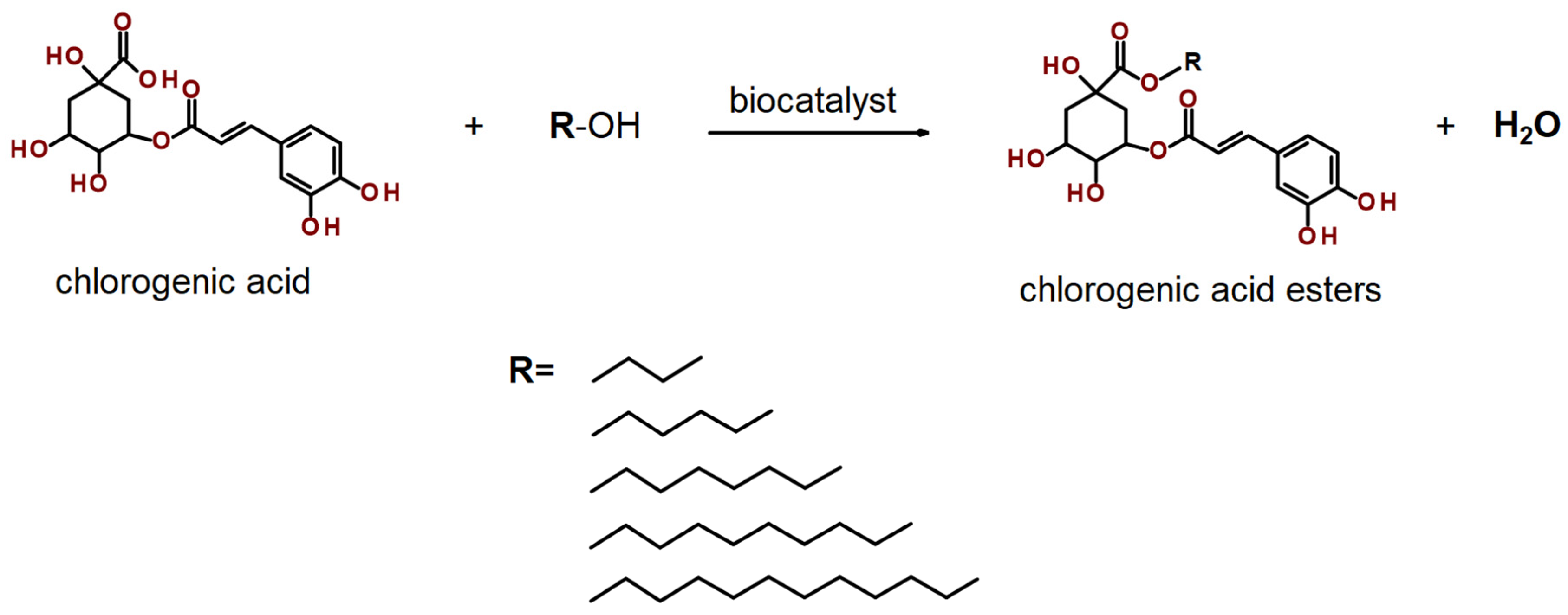 Chlorogenic acid is a widely distributed plant-derived compound, found in significant amounts in coffee beans, stone fruits, berries, and cruciferous vegetables. It is known for a range of beneficial biological effects, including strong antioxidant properties, protection of the intestinal and hepatic barriers, and demonstrated efficacy in the prevention and treatment of obesity and type II diabetes. Due to its polar nature, chlorogenic acid has limited solubility in lipid matrices, which restricts its applicability in the food, pharmaceutical, and cosmetic industries. Its hydrophobicity can be increased through chemical or enzymatic lipophilization, which involves the esterification of the carboxyl group with a fatty alcohol. The enzymatic approach is particularly favoured, as the use of biocatalysts allows for milder reaction conditions, enhanced selectivity, and minimized formation of by-products. Moreover, enzymatic reactions are environmentally friendly, requiring less energy and producing lower amounts of waste [40,49,50,51].
