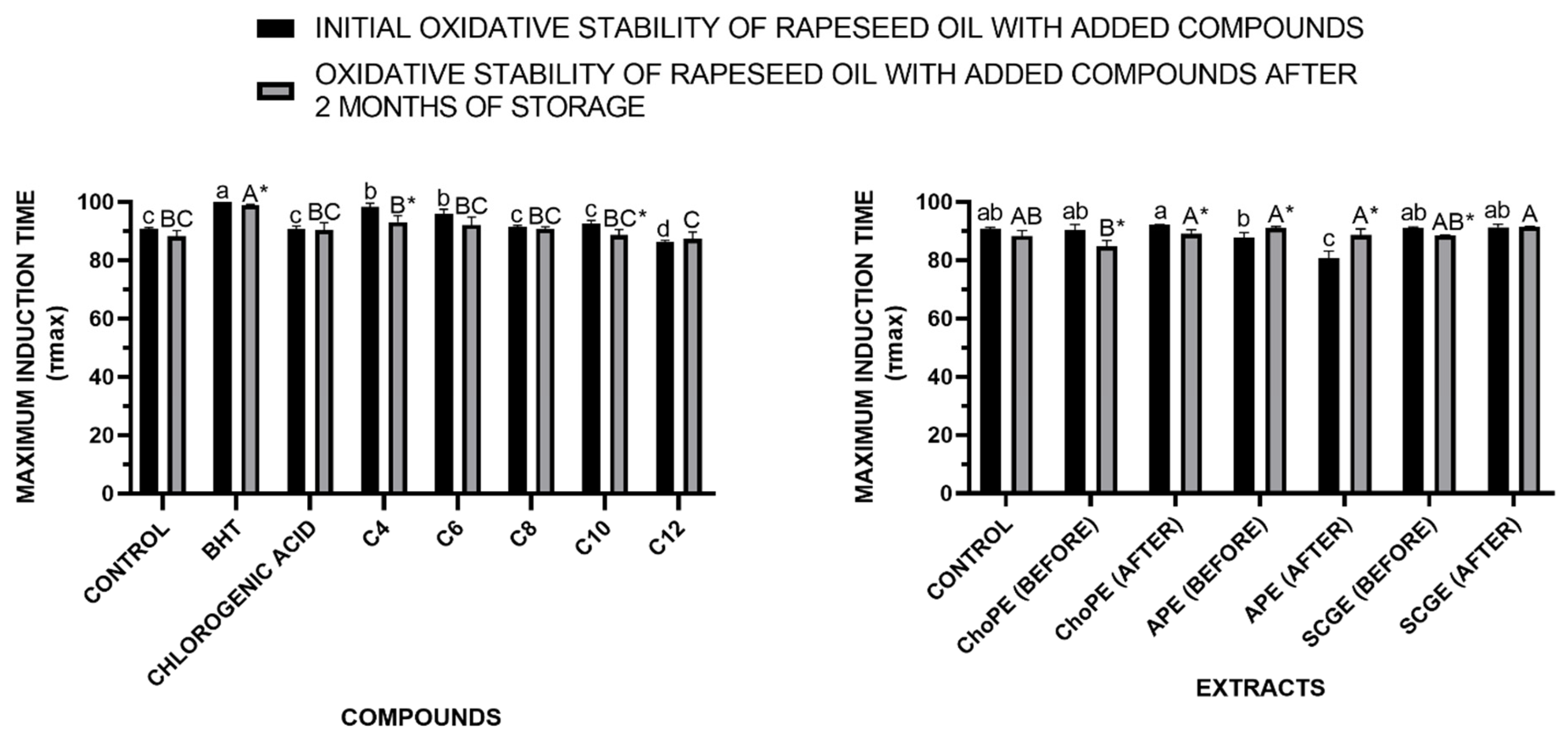 The oxidative stability of rapeseed oil with the addition of chlorogenic acid, its alkyl esters (C4–C12), BHT (as a reference compound), and food waste extracts was evaluated both at the initial time point and after two months of storage. As shown in Figure 8, the highest initial maximum oxidation time of vegetable oil was observed with the addition of BHT (τmax = 101.8 min), followed closely by the short-chain chlorogenates, particularly the butyl (C4—τmax = 98.3 min.) and hexyl (C6—τmax = 95.9 min) esters. In contrast, oil with native chlorogenic acid exhibited significantly lower stability (τmax = 90.7 min), which further declined after storage. This correlates with the results obtained, as the butyl and hexyl esters of chlorogenic acid exhibited the strongest antioxidant activity among the tested derivatives. Their enhanced lipophilicity relative to native chlorogenic acid likely facilitated more effective dissolution within the lipid matrix, contributing to their improved performance. After two months of storage, a slight but statistically significant reduction in the stability of oil was observed for the addition of several esters, most notably in the case of the butyl (C4—τmax = 93.2 min) and decyl (C10—τmax = 88.7 min) derivatives.