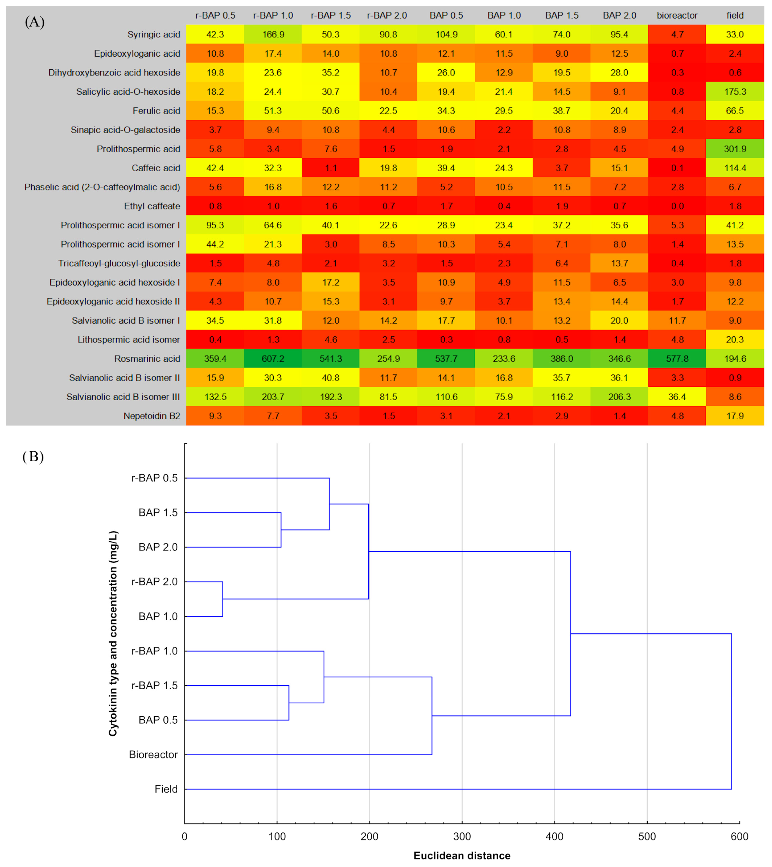 - Grzegorczyk-Karolak, I.; Krzemińska, M.; Kiss, A.K.; Owczarek-Januszkiewicz, A.; Olszewska, M.A. Role of phytohormones in biomass and polyphenol accumulation in Salvia bulleyana in vitro culture. Biomolecules 2023, 13, 227. [Google Scholar] [CrossRef]