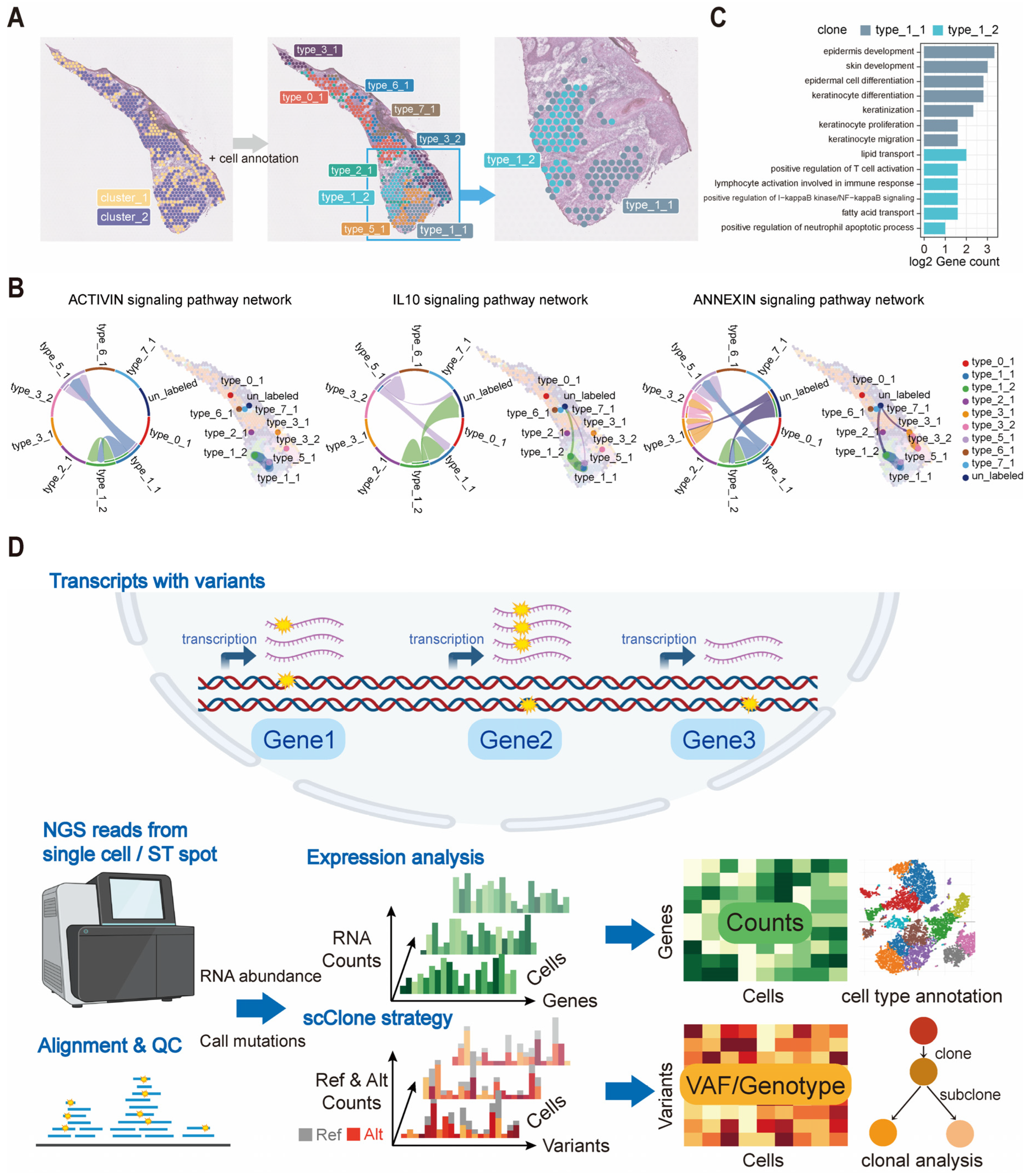 - scClone can be applied to spatial transcriptomics and identifies subclonal structures on histological sections that traditional methods fail to detect.