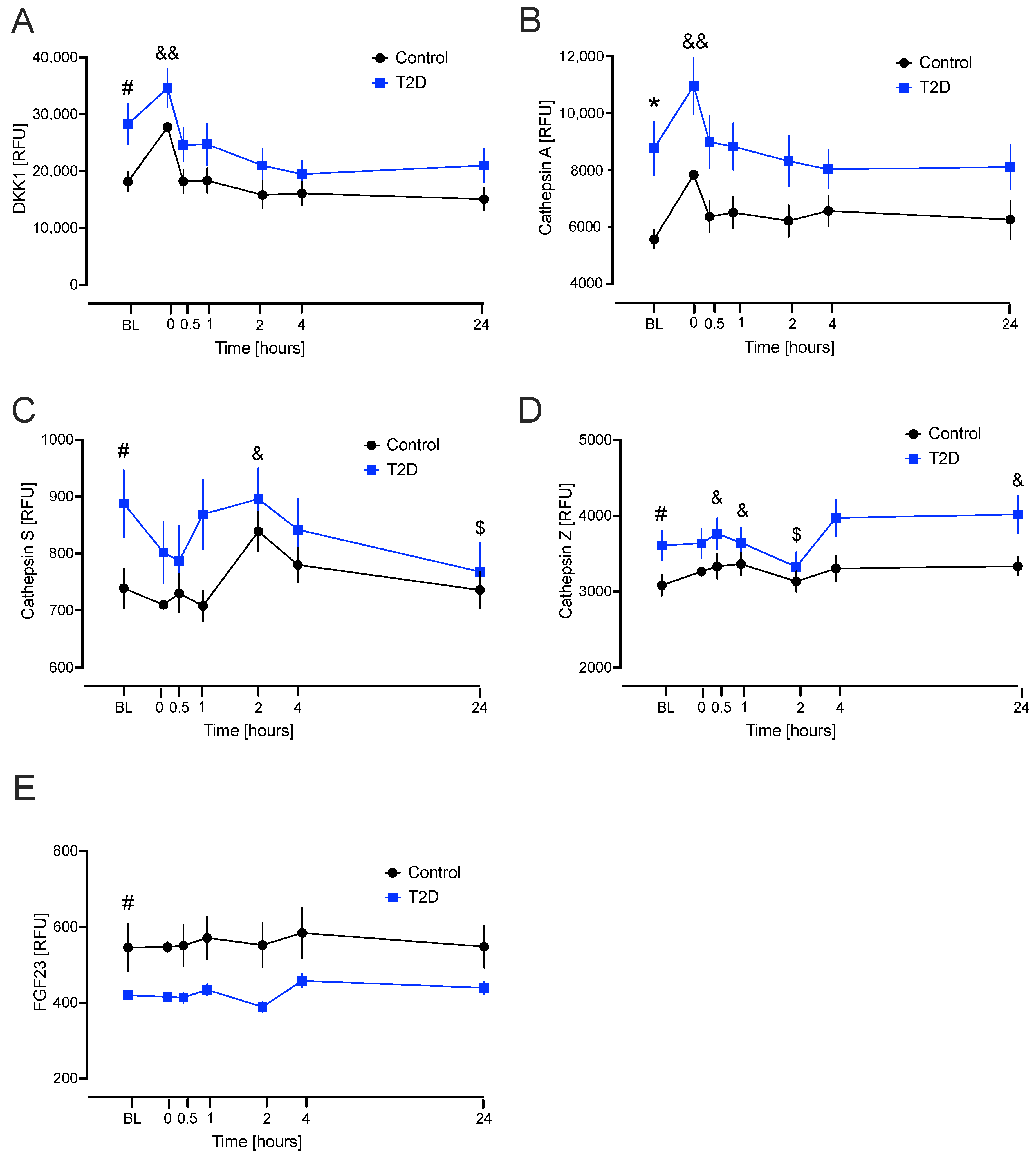 Figure 1. Significant changes in bone marker proteins in plasma that differed at baseline between type 2 diabetes (T2D) and control cohorts. Blood sampling was performed at baseline (BL), at hypoglycaemia (0 min), and post-hypoglycaemia (30 min, 1, 2, 4 and 24 h) for controls (black circles) and for T2D (blue squares). At BL, blood sugar (BS) was 7.5 ± 0.4 mM (for T2D) and 5.0 ± 0.1 mM (for control, C). At the point of hypoglycaemia, blood sugar (BS) was 2.0 ± 0.03 mM (for T2D) and 1.8 ± 0.05 mM (for control). (A) Dickkopf-related protein 1 (DKK1); (B) cathepsin A; (C) cathepsin S; (D) cathepsin Z; (E) fibroblast growth factor 23 (FGF23). Statistics: # p < 0.05 and * p < 0.01, comparison between T2D vs. Control. $ p < 0.05 comparison from baseline in T2D; & p < 0.05 and && p < 0.01, comparison from baseline for combined groups. RFU, Relative fluorescent unit.