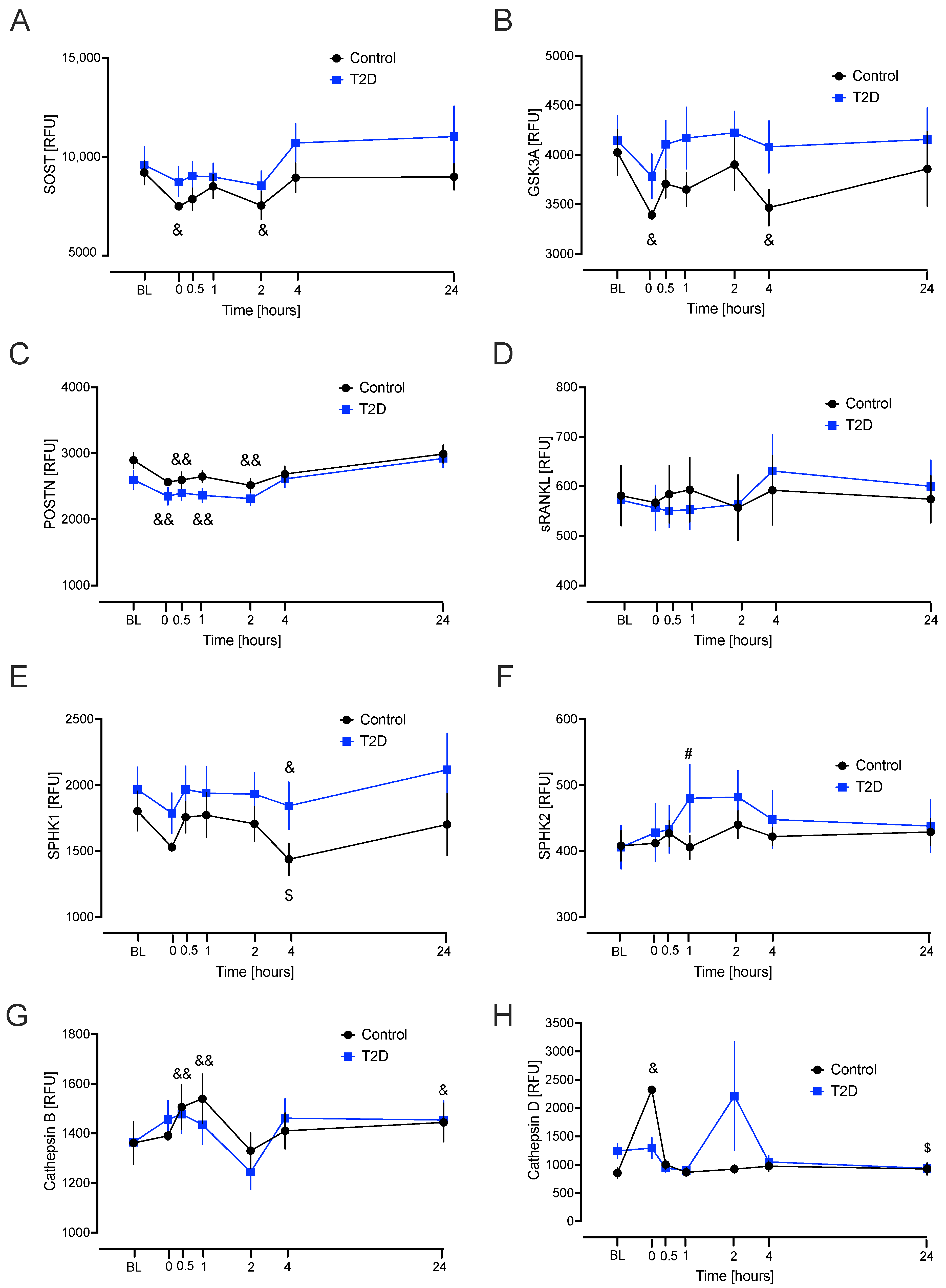 Figure 2. Significant changes in bone marker proteins in plasma that differed in response to hypoglycaemia from baseline in type 2 diabetes (T2D) and control cohorts. Blood sampling was performed at baseline (BL), at hypoglycaemia (0 min), and post-hypoglycaemia (30 min, 1, 2, 4, and 24 h) for controls (black circles) and for T2D (blue squares). At BL, blood sugar (BS) was 7.5 ± 0.4 mM (for T2D) and 5.0 ± 0.1 mM (for control, C). At the point of hypoglycaemia, blood sugar (BS) was 2.0 ± 0.03 mM (for T2D) and 1.8 ± 0.05 mM (for control). (A) Sclerostin (SOST); (B) Glycogen synthase kinase-3 alpha/beta (GSK3A); (C) Periostin (POSTN); (D) Tumor necrosis factor ligand superfamily member 11 (sRANKL); (E) Sphingosine kinase 1 (SPHK1); (F) Sphingosine kinase 2 (SPHK2); (G) cathepsin B; (H) cathepsin D. Statistics: # p < 0.05, comparison between T2D vs. Control. $ p < 0.05 comparison from baseline in T2D; & p < 0.05 and && p < 0.01, comparison from baseline for combined groups. RFU, Relative fluorescent unit.
