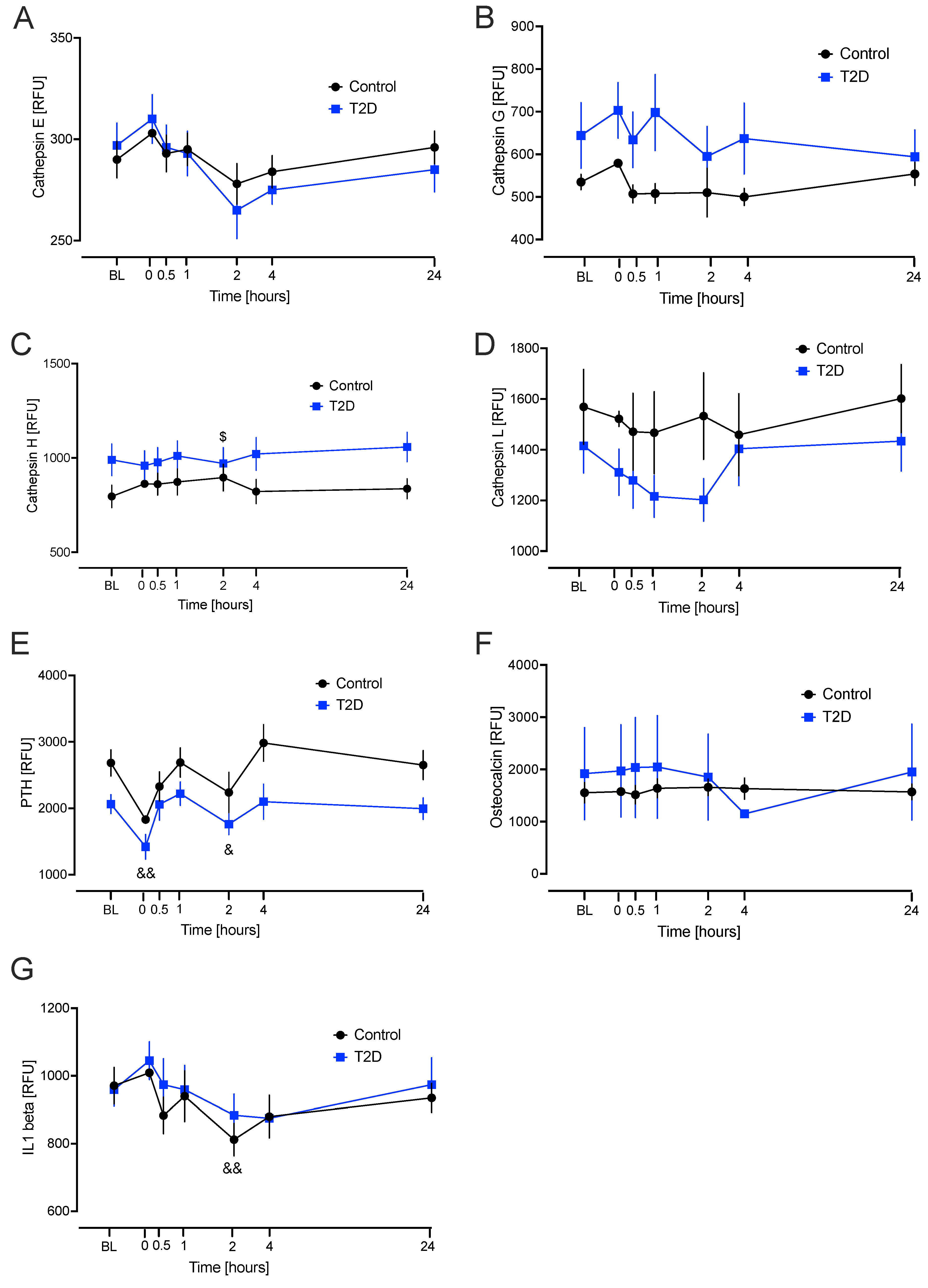 Figure 3. Significant changes in bone marker proteins in plasma that differed in response to hypoglycaemia from baseline in type 2 diabetes (T2D) and control cohorts. Blood sampling was performed at baseline (BL), at hypoglycaemia (0 min), and post-hypoglycaemia (30 min, 1, 2, 4, and 24 h) for controls (black circles) and for T2D (blue squares). At BL, blood sugar (BS) was 7.5 ± 0.4 mM (for T2D) and 5.0 ± 0.1 mM (for control, C). At the point of hypoglycaemia, blood sugar (BS) was 2.0 ± 0.03 mM (for T2D) and 1.8 ± 0.05 mM (for control). (A) cathepsin E; (B) cathepsin G; (C) cathepsin H; (D) cathepsin L; (E) parathyroid hormone (PTH); (F) osteocalcin; (G) Interleukin-1 beta (IL-1 beta). Statistics: $ p < 0.05 comparison from baseline in T2D; & p < 0.05 and && p < 0.01, comparison from baseline for combined groups. RFU, Relative fluorescent unit.