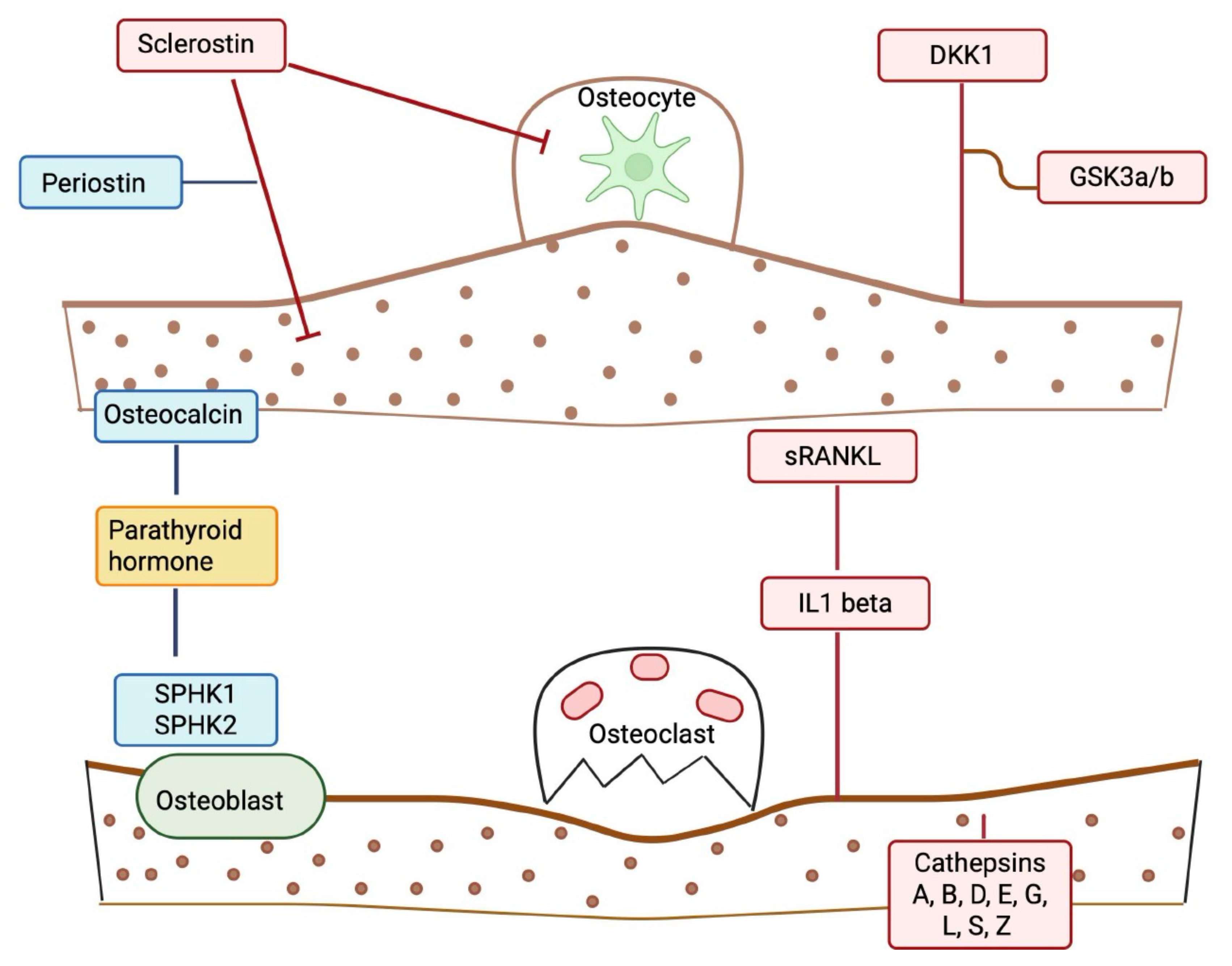 Figure 4. A schematic to illustrate the effects of the bone marker proteins on bone metabolism. Proteins depicted in blue are anabolic/formation factors. Proteins depicted in red are catabolic/formation factors. The protein in yellow (parathyroid hormone (PTH)) is a mixed regulatory factor. Straight lines indicate a stimulatory effect; blunt-ended lines indicate an inhibitory effect. The illustration was created using BioRender.com (with publication license).