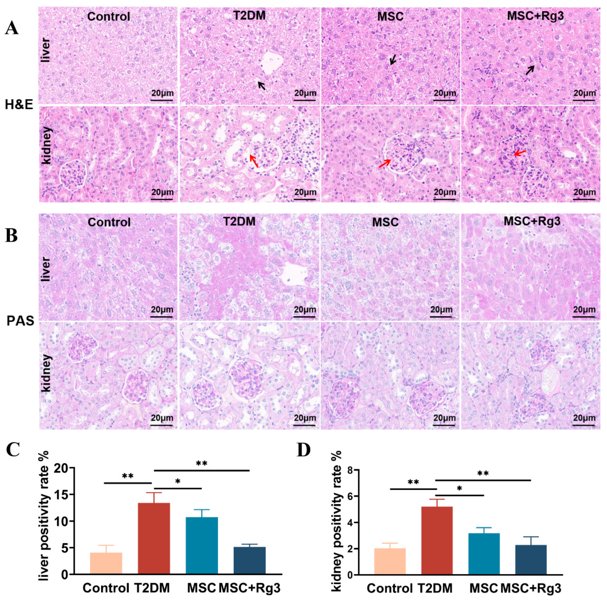 2.5. HUCMSCs Combined with 20(R)-Rg3 Promote Glycogen Storage in T2DM Mice
