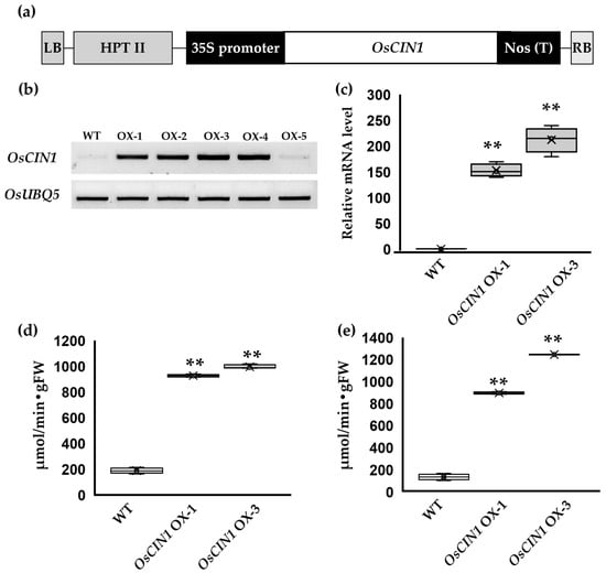 To analyze the function of overexpressed OsCIN1 in rice, we cloned the full-length coding sequence (CDS) of the OsCIN1 gene under the control of the 35S promoter (Figure 1a). Following transformation, regenerated plants were selected on hygromycin-containing medium. Multiple independent transgenic lines exhibiting differential OsCIN1 expression were obtained. Among these, an intermediate expresser OsCIN1 OX-1 and the highest expresser OsCIN1 OX-3 were identified by semi-quantitative RT-PCR (Figure 1b) and subsequently confirmed by quantitative RT-PCR (qRT-PCR) to quantify transcript accumulation (Figure 1c). Enzymatic assays were performed to quantify CIN activity in the two independent lines. Across both vegetative and reproductive stages, CIN activity in leaves and stem segments of the OX lines was consistently and significantly higher than that of the wild type (WT) (Figure 1d,e).
