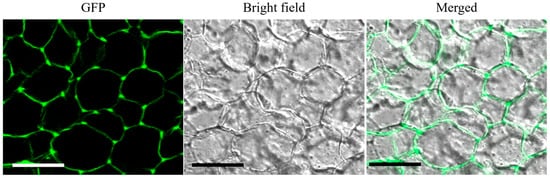Multiple studies have established that CINs are in the apoplast, where they hydrolyze sucrose into glucose and fructose [,]. They interact with cell wall matrix polysaccharides through noncovalent forces such as ionic and hydrogen bonds rather than being covalently anchored []. This activity shapes apoplastic sugar levels and maintains the sucrose gradient that governs source-sink carbon flux []. To determine whether OsCIN1, like other CINs, is localized in the apoplast, GFP-tagged OsCIN1 (OsCIN1-GFP) was expressed in transgenic callus tissue and examined by confocal fluorescence microscopy. The GFP signal confirmed that OsCIN1 localizes to the apoplast (Figure 3).