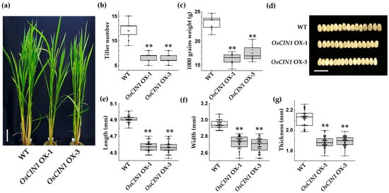 Phenotypic characterization of OsCIN1 OX plants in paddy field conditions. (a) Representative plants of WT and OX lines at the flowering stage in the field. (b) Tiller number per plant. (c) 1000-grain weight. (d) Representative grain morphology showing width differences. (e–g) Grain length, width, and thickness, respectively. Scale bars, 10 cm (a); 1 cm (d). Each value represents the mean ± SE; n = eight plants (b) and n = 60 grains (e–g). Statistical analysis was performed using Student’s t-test. ** p < 0.01.
