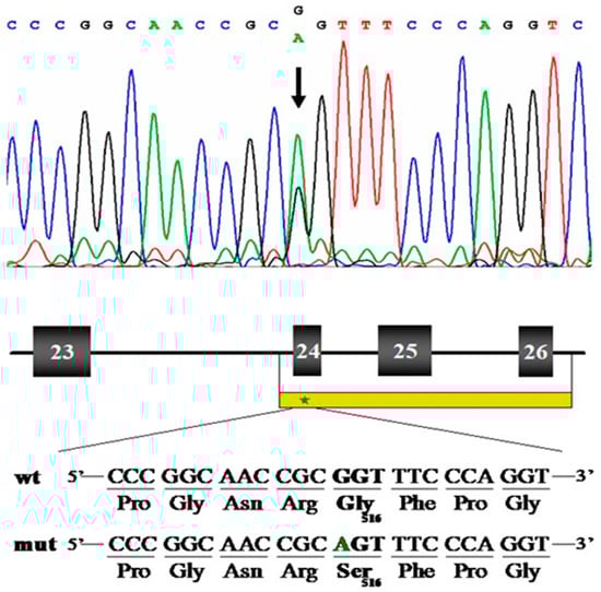Nucleotide sequence analysis of exon 24, 25, and 26 portions of COL2A1 and adjacent intronic regions of the affected individual. The individual was heterozygous for the transition, indicated by the arrow. The approximate location for PCR amplification was marked by a yellow bar beneath the schematic, a partial drawing of the COL2A1 genomic structure. A green asterisk indicated the mutation site. The translated products were shown below the normal and mutant sequences, respectively.