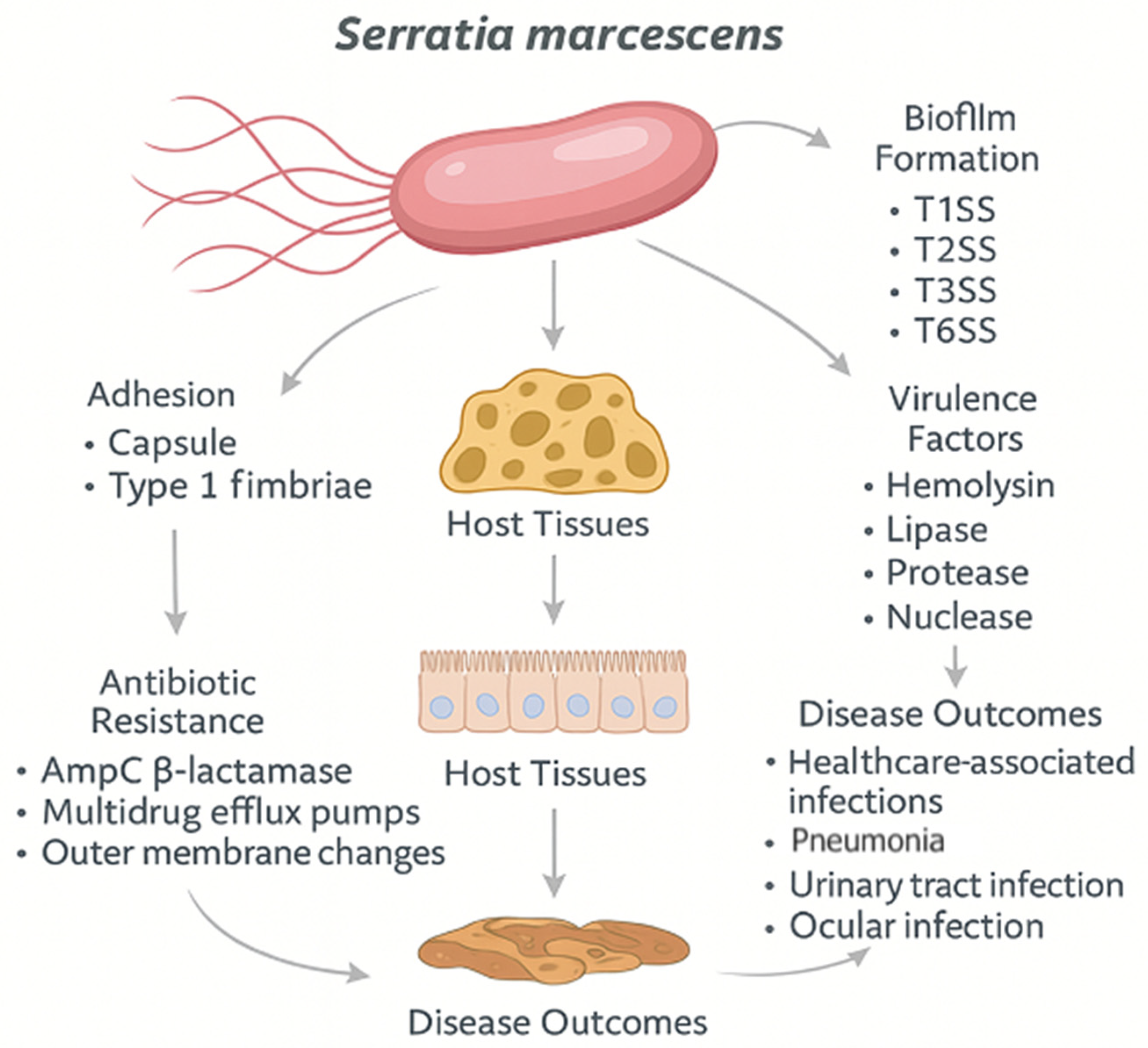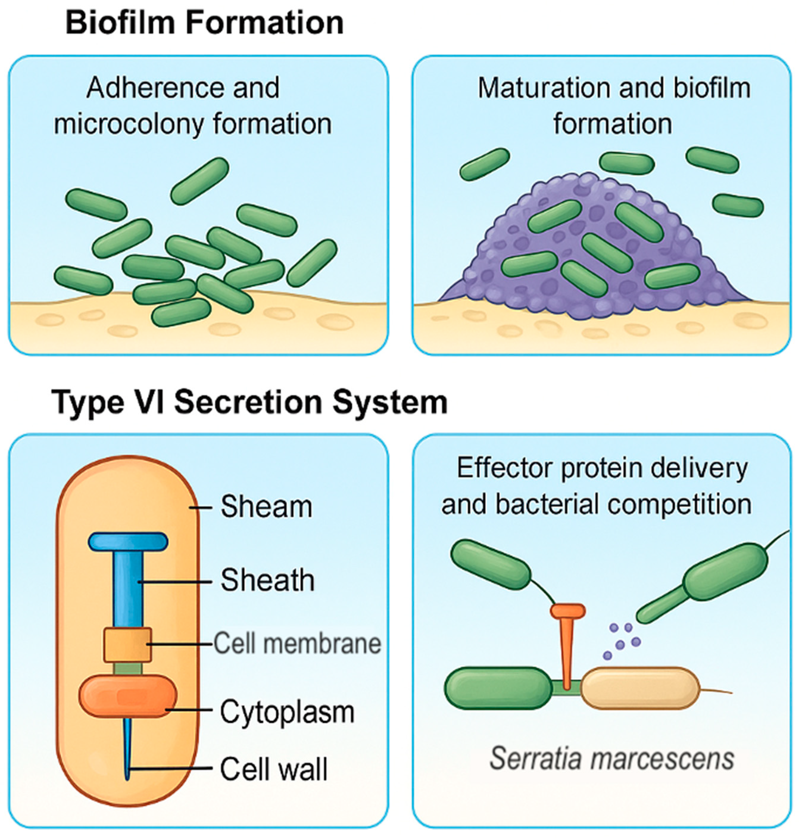- Type VI Secretion System (T6SS): Functions in bacterial competition and delivery of toxins to eukaryotic cells. The T6SS is particularly active in biofilm and polymicrobial environments. The Type VI Secretion System is especially crucial in interbacterial antagonism, particularly in polymicrobial environments. T6SS in S. marcescens is encoded by hcp/vgrG loci and is closely regulated by quorum sensing and stress responses [48].