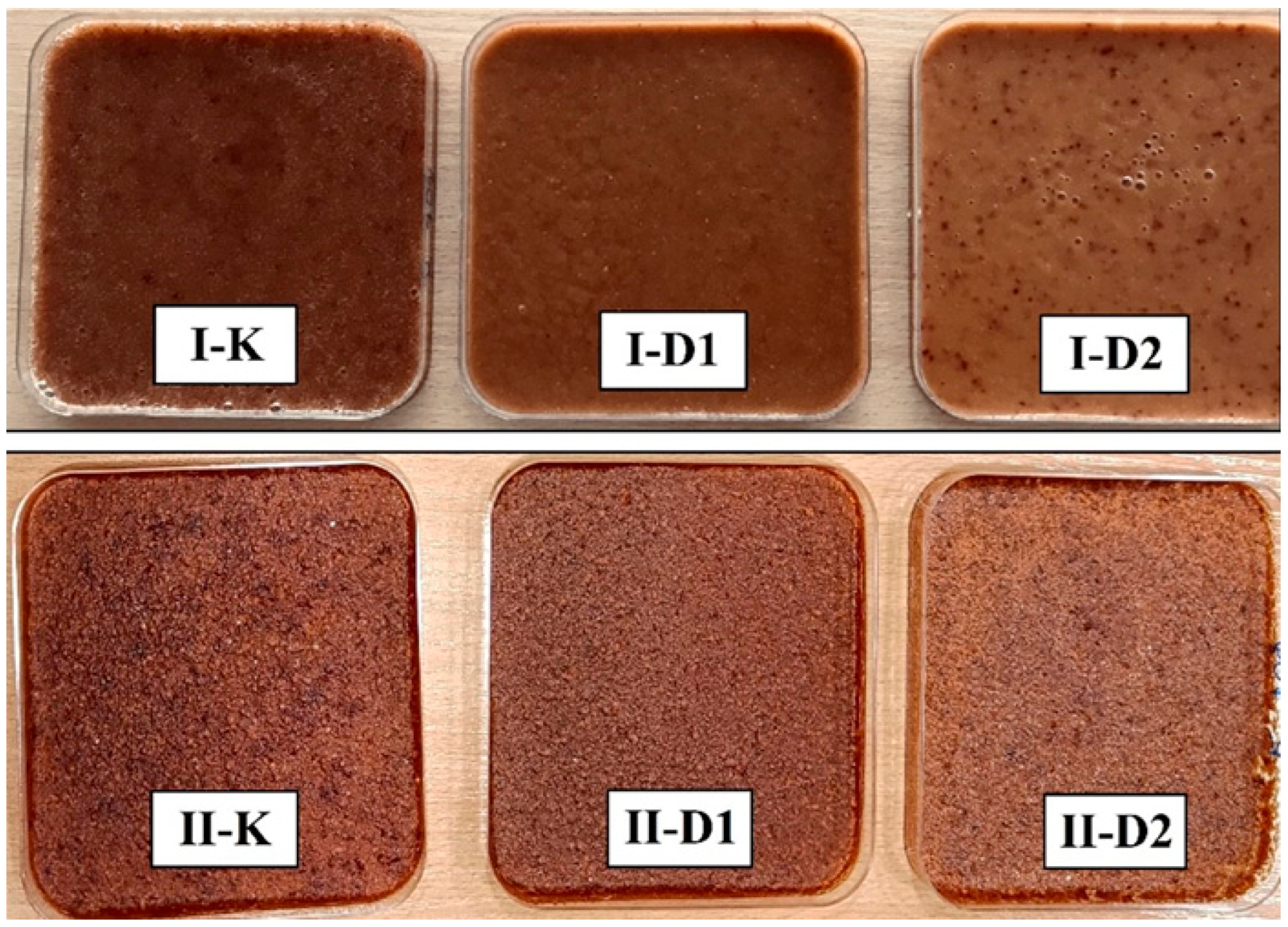 A visual comparison of the freshly prepared and dried mousses is presented in Figure 1. All variants exhibited a characteristic brownish hue derived from the fruit raw materials. However, distinct differences in colour intensity and texture were observed. The mousses fortified with vitamin D3 and sea buckthorn oil (D1 and D2) appeared visibly lighter than the traditional control mousse (K). The colour change was less pronounced in the mousse fortified via encapsulation (D1) compared to the one with direct addition (D2). This can be attributed to the reduction in oil droplet size during nanoemulsion formation via ultrasonication [9] and the subsequent encapsulation within a pectin matrix, which isolates the oil and its pigments from the external environment, leading to higher homogeneity and a lesser impact on the product’s colour [14]. Furthermore, the dried sample of the encapsulated mousse (D1) exhibited a more uniform, homogeneous, and smoother texture compared to the other variants.