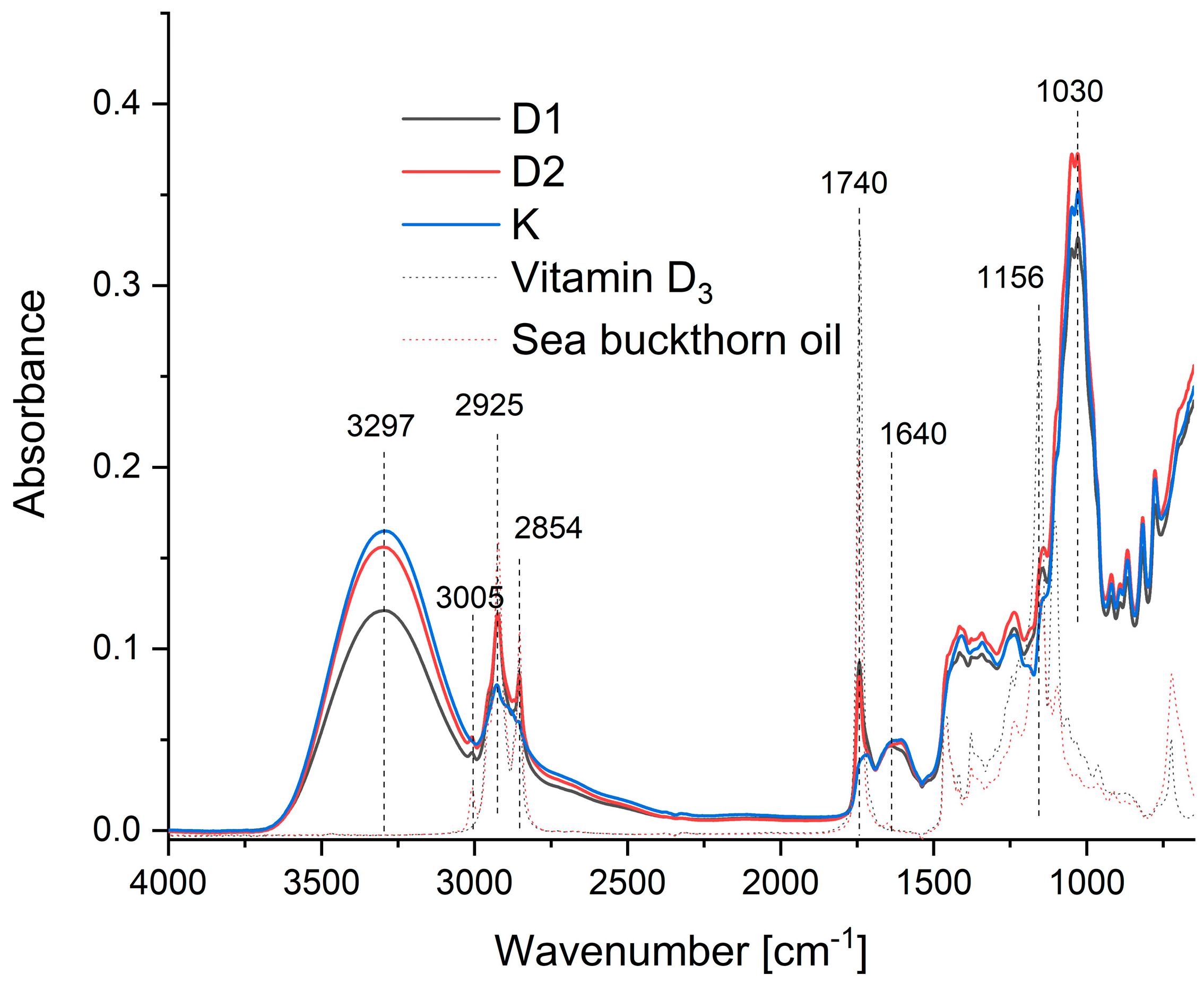 Figure 3. FTIR spectra of the analysed samples: control mousse (K), mousse fortified via encapsulation (D1), mousse fortified via direct addition (D2), pure vitamin D3, and pure sea buckthorn oil.