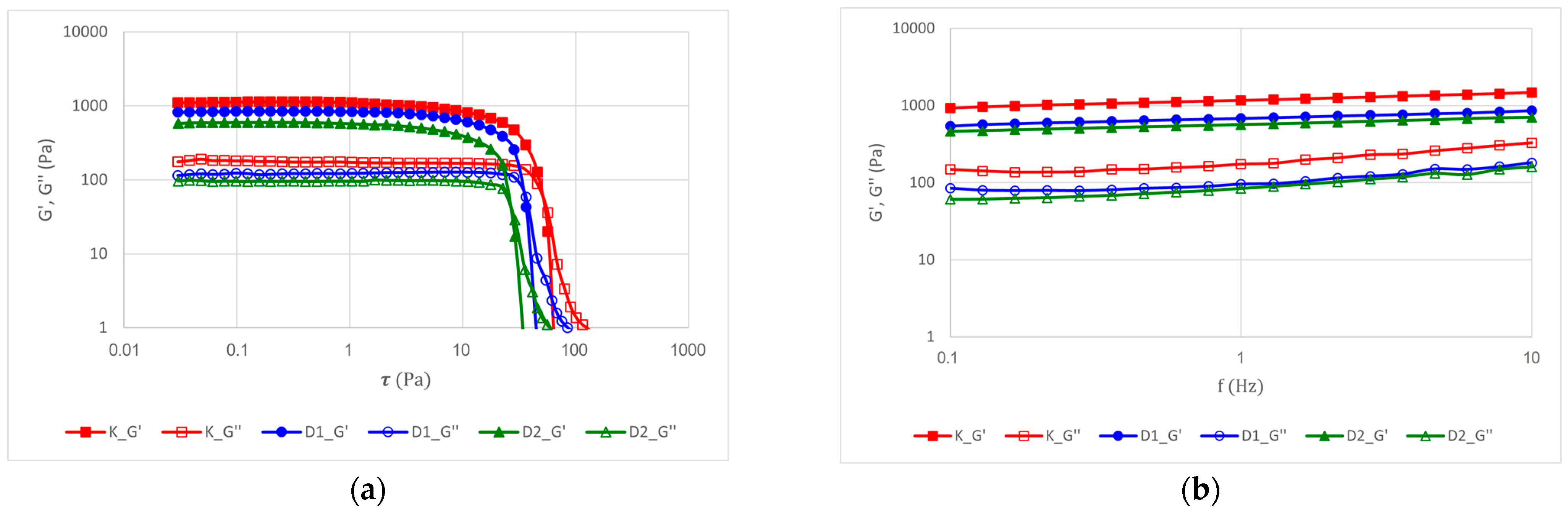 The rheological behaviour of the mousses was characterised by strain and frequency sweep tests. In the strain sweep (Figure 4a), all mousses exhibited a linear viscoelastic region (LVR) at low strains (<10 Pa), where the storage (G′) and loss (G″) moduli were constant, indicating a stable structure. Beyond a critical strain of 10 Pa, a sharp decrease in both moduli was observed, signifying the irreversible breakdown of the mousse structure [8]. The addition of sea buckthorn oil and propolis caused a slight decrease in the structural stability of the mousses, which was more evident in the sample containing non-encapsulated additives (D2). This finding is consistent with the observations of Wang et al. [55]. Samples with higher oil concentrations exhibited a more pronounced decrease in storage modulus compared to those with lower oil content, indicating that increased oil addition leads to a less stable gel structure under large deformation.