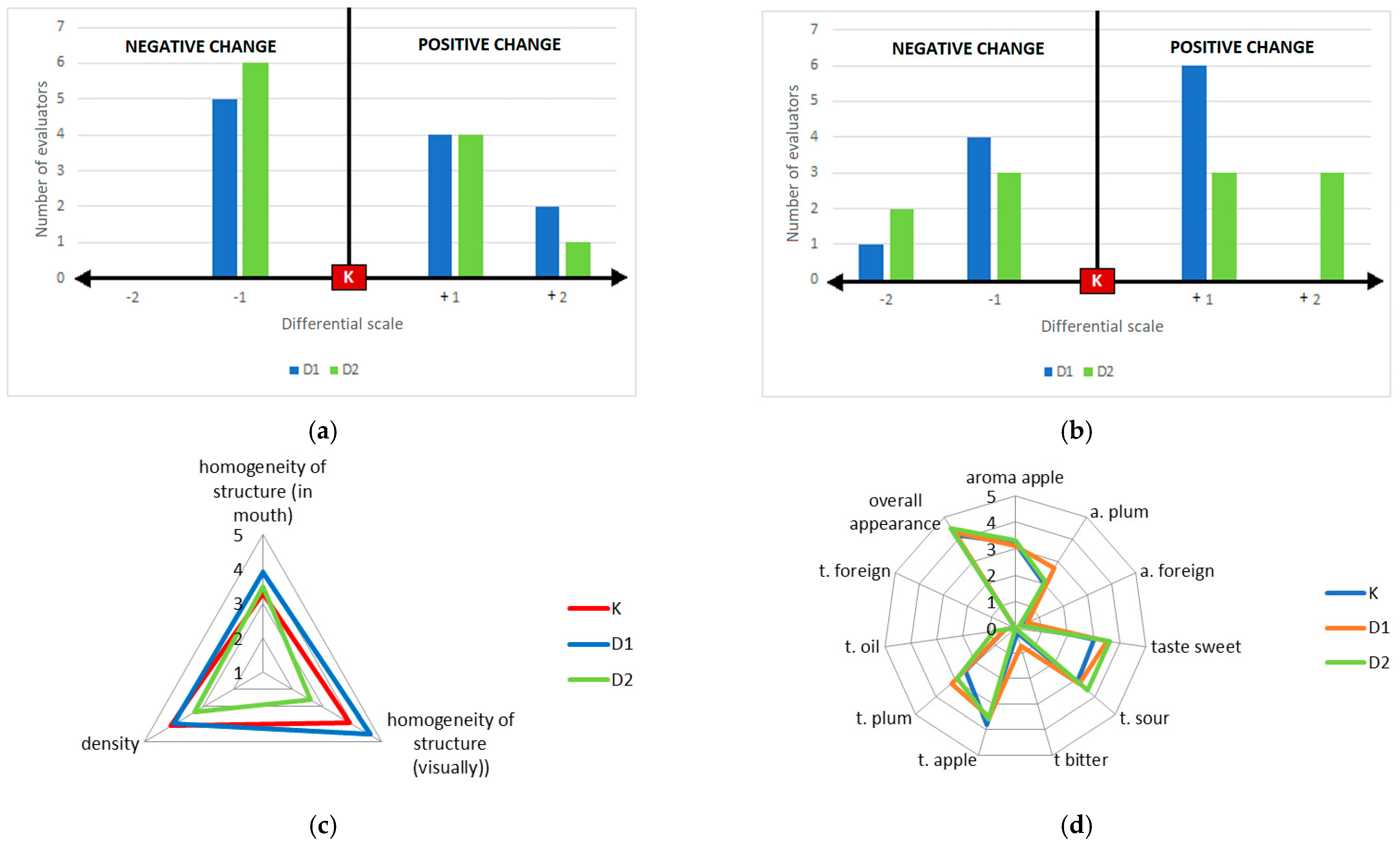 The flavour profile (Figure 5d) revealed that the fortified mousses had a more intense plum flavour and were perceived as sweeter and more acidic than the control. The encapsulated mousse (D1) had a lower perceived acidity than the direct addition variant (D2), suggesting partial masking of the sour notes from the sea buckthorn oil, a known benefit of encapsulation [35]. A slight aftertaste (described as oily or astringent) was noted by a few panellists for both fortified mousses, with no significant difference between the methods. Crucially, the overall appearance (Figure 5d) for all mousses was above 4.0 on a 5-point scale, and no differences were found between the control and the fortified variants. This demonstrates that the enrichment did not compromise the overall sensory acceptability of the product.