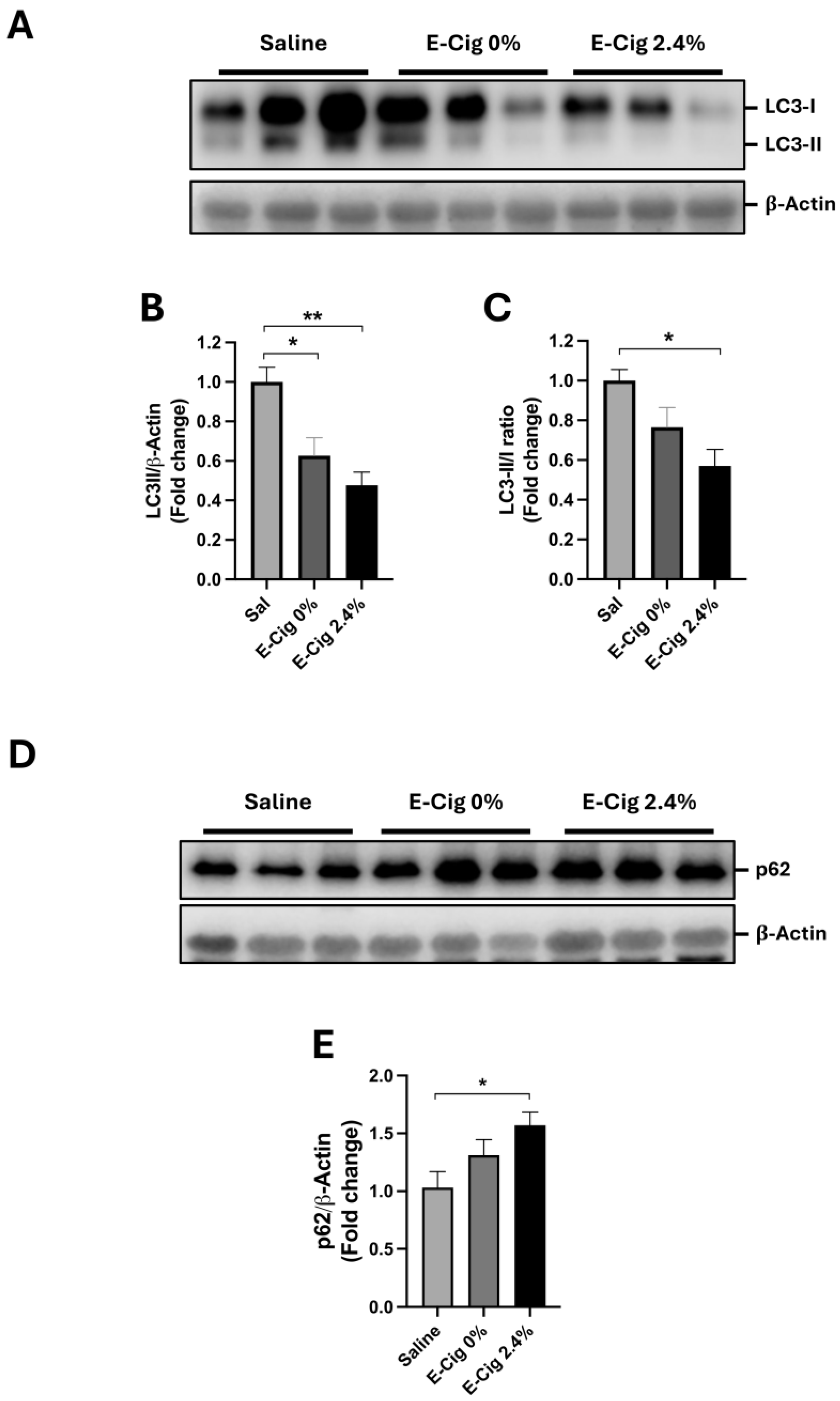 2.4. Effects of E-Cig Exposure on Autophagic Proteins LC3B
