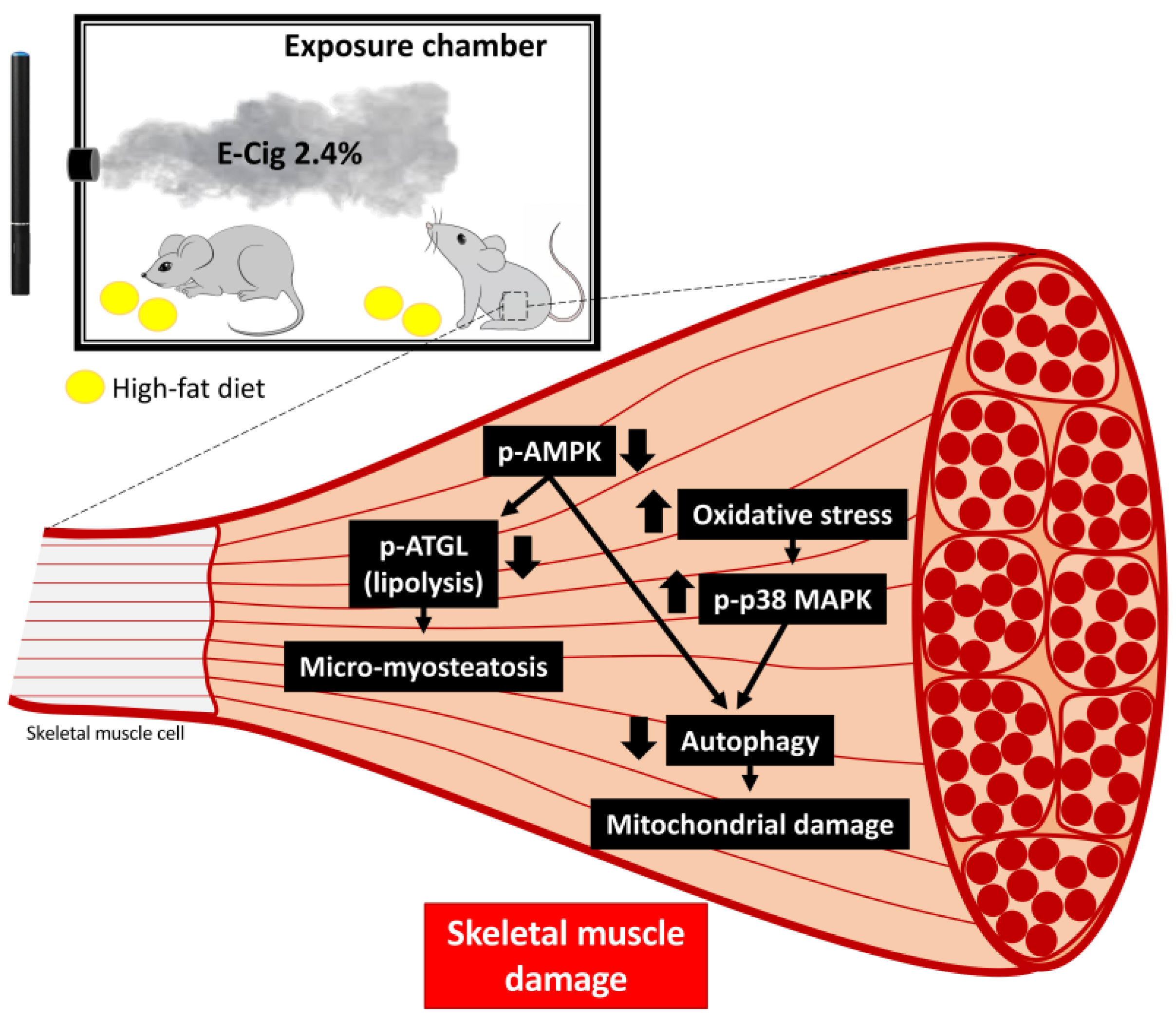 - Nogueira, L.; Zemljic-Harpf, A.E.; Yusufi, R.; Ranjbar, M.; Susanto, C.; Tang, K.; Mahata, S.K.; Jennings, P.A.; Breen, E.C. E-cigarette aerosol impairs male mouse skeletal muscle force development and prevents recovery from injury. Am. J. Physiol. Regul. Integr. Comp. Physiol. 2022, 323, R849–R860. [Google Scholar] [CrossRef]