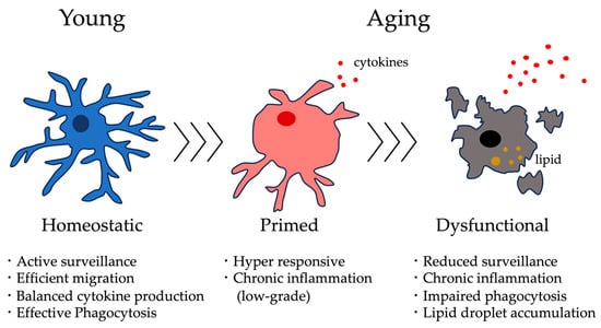When considering microglia, should we view them as friends or as foes? Microglia, the resident immune cells of the central nervous system (CNS), play indispensable roles in maintaining brain homeostasis through immune surveillance and the clearance of cellular debris [,]. Under physiological conditions, microglia exhibit a highly dynamic and ramified morphology, constantly monitoring the neural environment to preserve tissue integrity []. However, with advancing age, microglia undergo profound morphological and functional alterations, including chronic activation, reduced motility, and dysregulated phagocytic activity [,,]. These age-related changes lead to the establishment of a proinflammatory milieu and impaired clearance of waste products, thereby exerting deleterious effects on the nervous system and acting as “foes.” Indeed, abnormal activation and functional decline of microglia have been implicated in the pathogenesis of age-related neurodegenerative diseases, including Alzheimer’s disease (AD), the most common form of dementia [,]. Thus, understanding how microglia change with age is crucial for developing effective preventive and therapeutic strategies against such disorders. These age-dependent alterations in microglial function have also been recognized as key contributors to cognitive frailty, a condition defined by the coexistence of physical frailty and mild cognitive impairment (MCI). Cognitive frailty represents a potentially reversible state of vulnerability that precedes irreversible neurodegeneration [,]. While frailty was initially defined by physical decline, the concept has recently been expanded to include cognitive impairment, positioning it as a bridge between normal aging and neurodegenerative diseases []. Elucidating how aging microglia contribute to this transition may therefore be essential for preventing the progression from cognitive frailty to age-related neurodegenerative conditions.