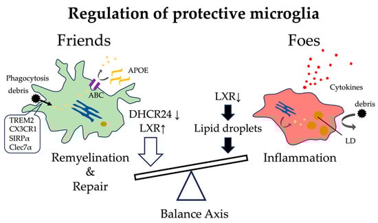 Regulation of friends-like microglia. Microglia maintain a balance between debris clearance and inflammation. LXR activation induced by DHCR24 downregulation promotes APOE-mediated lipid efflux and remyelination (“friends”), whereas impaired LXR signaling drives lipid droplet accumulation and cytokine release (“foes”). Arrows next to molecules indicate upregulation or activation (↑) and downregulation or impairment (↓). The block arrows pointing to the balance beam indicate the factors driving the shift in microglial phenotype.