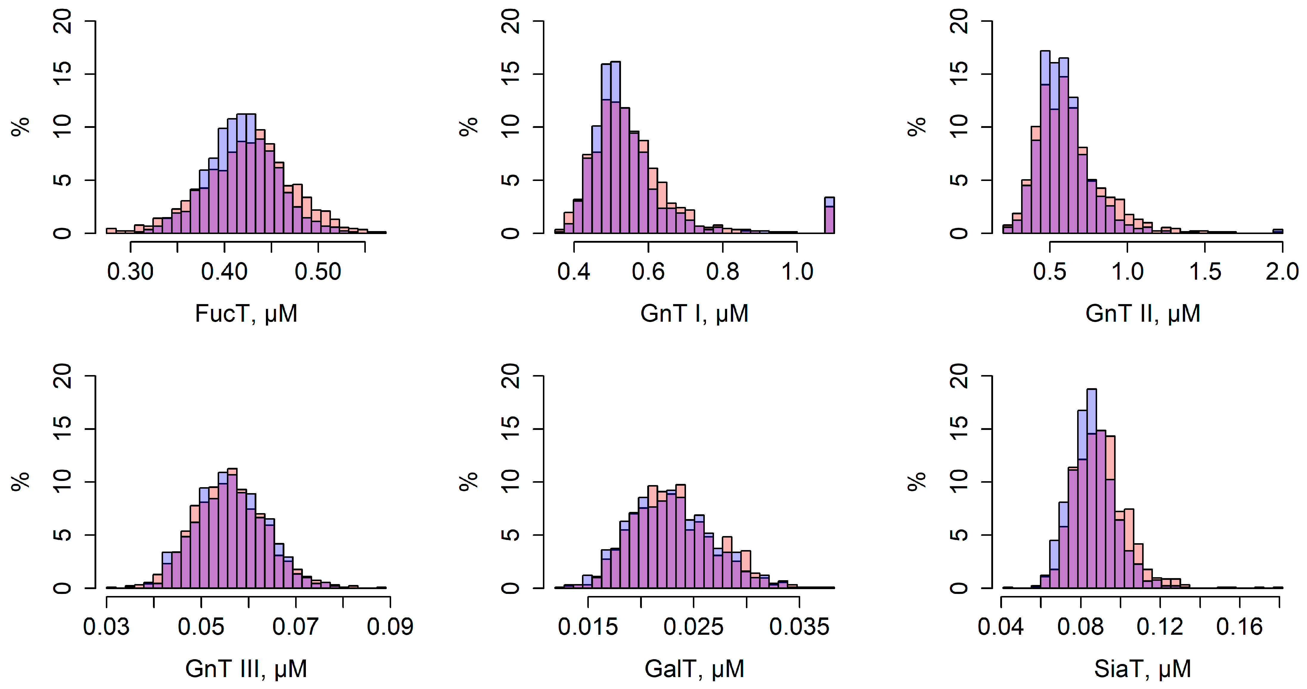| Distribution coefficients for total enzyme concentrations across Golgi compartments (Supplementary Table S2) | 23 coefficients: 4 per enzyme for GnT II, GnT III, Man II, GalT, and SiaT; plus 2 for GnT I in Golgi compartments III and IV; and 1 for FucT in the final Golgi compartment | [31] |