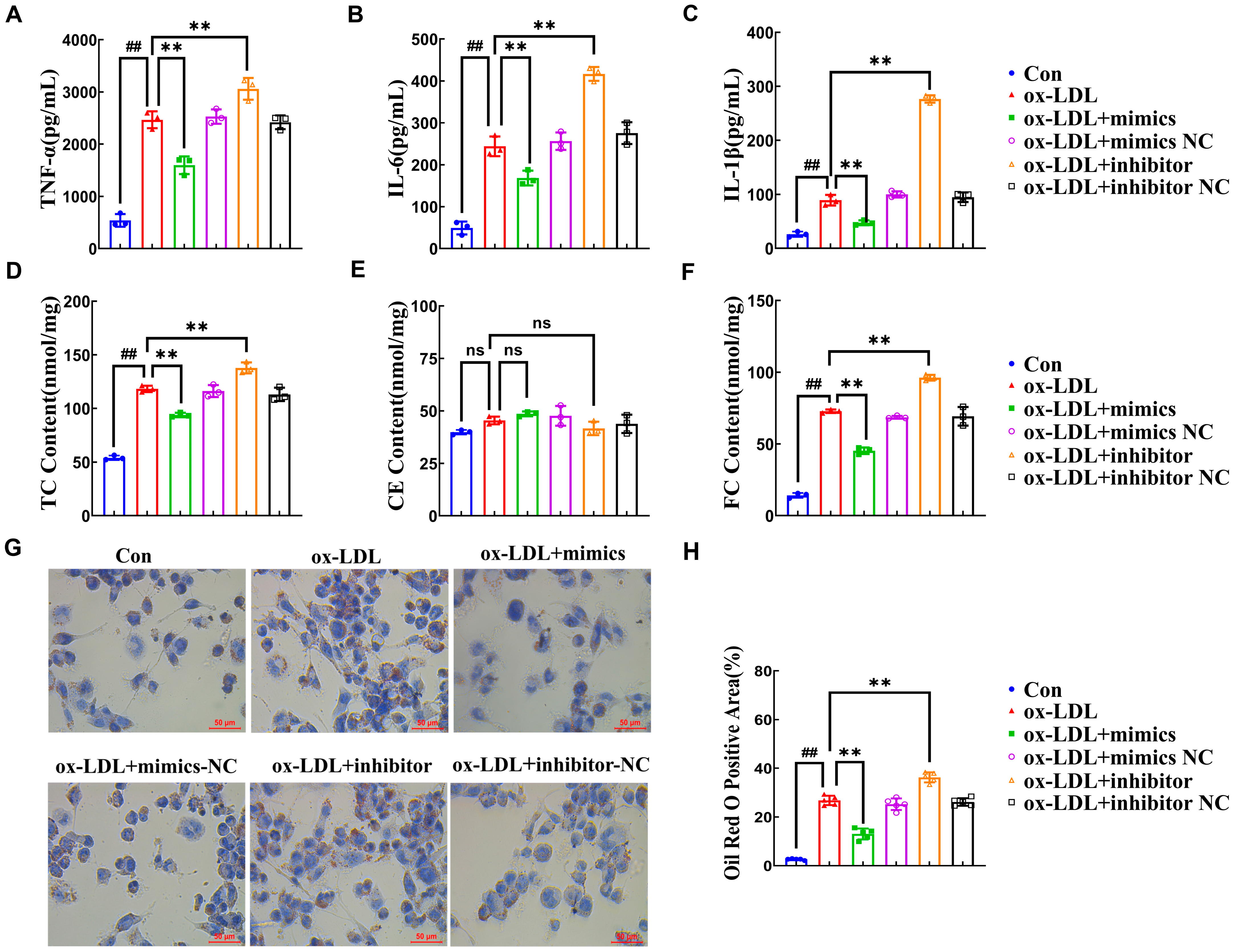 2.2. miR-590-5p Suppresses the Foam Cell Formation in ox-LDL-Induced PMA-THP-1 Macrophages