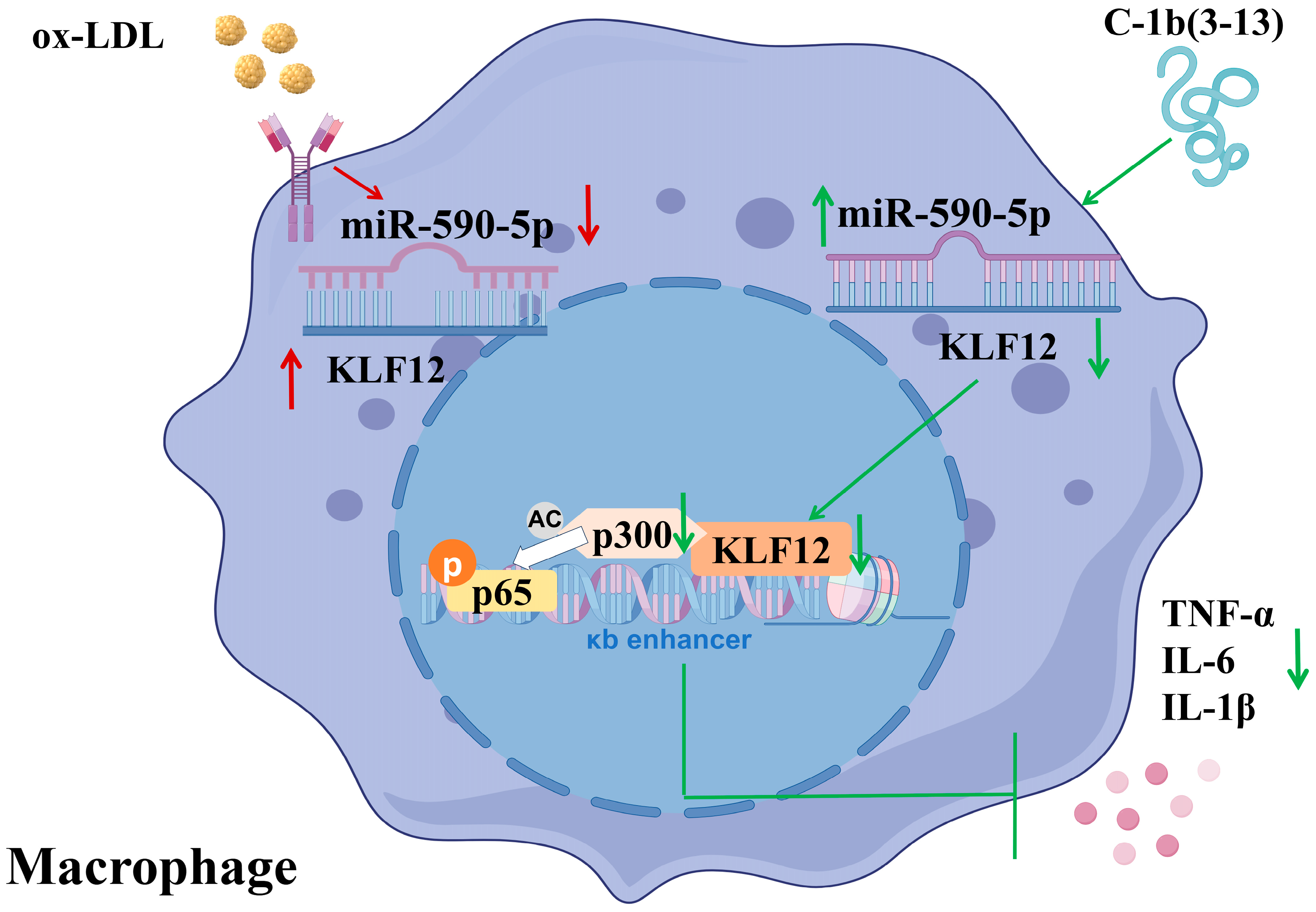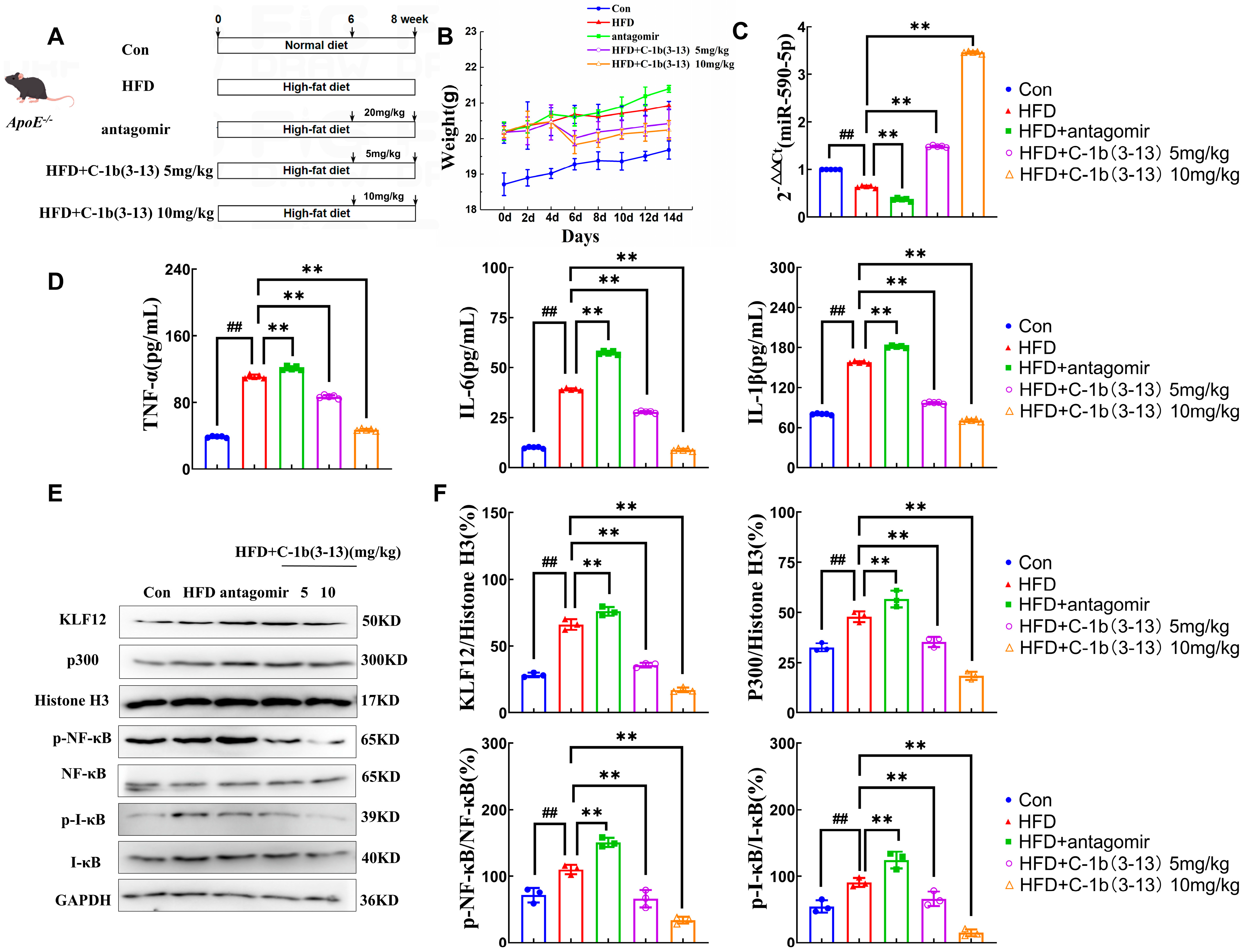 2.5. AMP C-1b(3-13) Inhibits AS in ApoE−/− Mice via the miR-590-5p/KLF12/p300 Axis