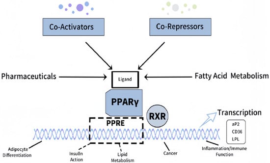 Mechanism of PPARγ activation. The ligand binding forms a heterodimer with RXR, binding to PPREs, and interacting with co-activators or co-repressors to regulate processes like adipogenesis, insulin signaling, and immune responses (Adapted from Houseknecht et al. []).