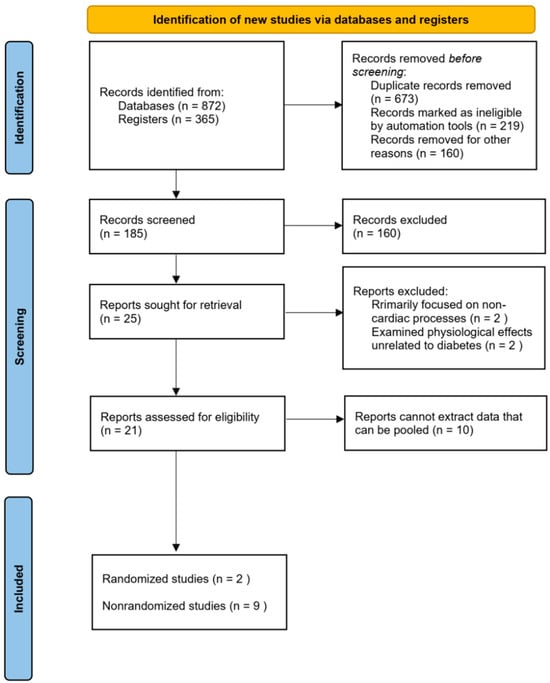 We identified 1237 records; after deduplication, 673 records were screened, 21 full-text reports were assessed for eligibility, and 11 studies were included. The PRISMA 2020 flow diagram is provided in Figure 3 [].