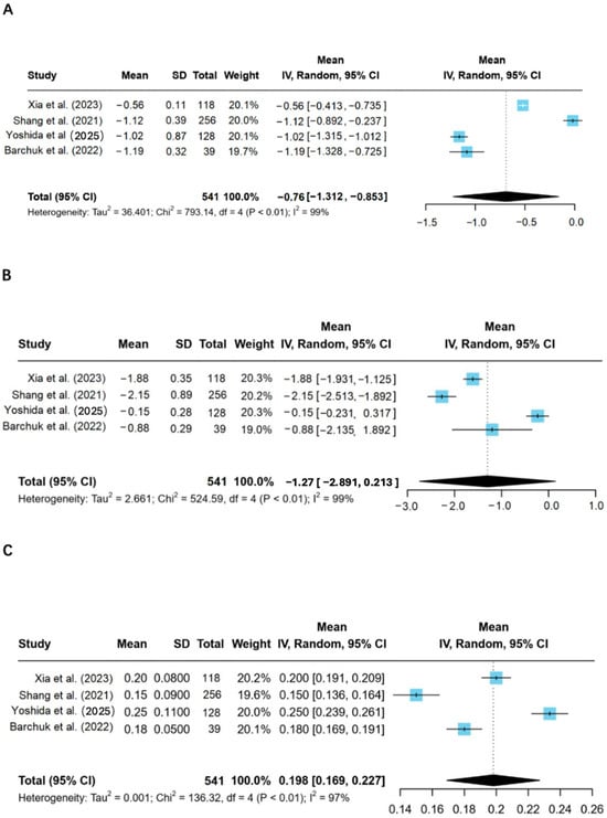 Triglycerides decreased by −0.76 mg/dL (95% CI: −1.312 to −0.853, p < 0.01) (Figure 4A), and LDL-C levels were reduced by −1.12 mg/dL (95% CI: −2.891 to −0.213, p < 0.01) (Figure 4B). Conversely, HDL-C levels increased by 0.198 mg/dL (95% CI: 0.169 to 0.227, p < 0.01) (Figure 4C), reflecting an improvement in the lipid profile. suggesting a potential reduction in cardiac strain associated with diabetes.