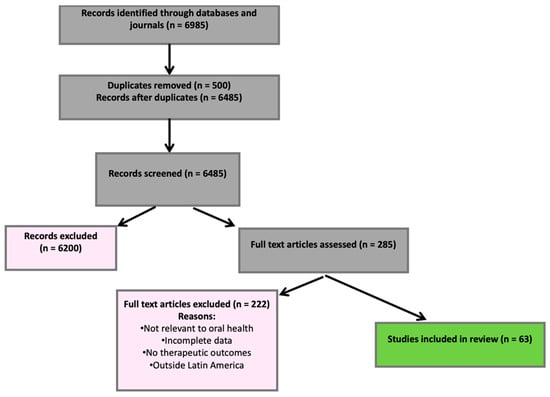 Records were identified through databases and journals (n = 6985). After removing duplicates (n = 500), 6485 records were screened, and 6200 were excluded. A total of 285 full-text articles were assessed for eligibility; 222 were excluded (not relevant to oral health, incomplete data, no therapeutic outcomes, or outside Latin America). Sixty-three studies were included in the final review.