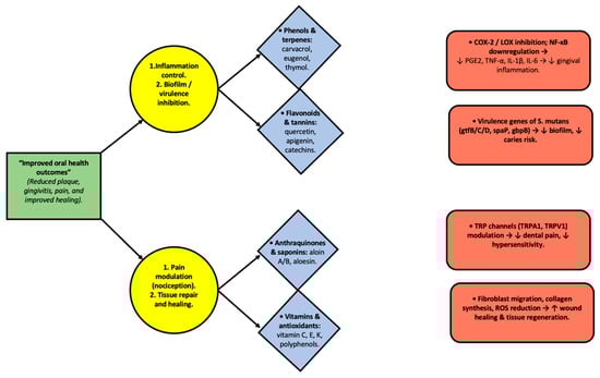 Integrative diagram illustrating the relationship between plant-derived metabolites, their molecular targets, and oral health outcomes. Phenols, flavonoids, anthraquinones, saponins, and vitamins act through specific pathways, including COX-2/LOX inhibition, NF-κB downregulation, modulation of Streptococcus mutans virulence genes, TRP channel regulation, and stimulation of fibroblast activity. These interactions contribute to reducing inflammation, inhibiting biofilm formation, modulating nociception, and enhancing wound healing, ultimately leading to improved oral health outcomes. Arrows indicate the direction of interaction and functional flow between bioactive compounds, molecular mechanisms, and oral effects.