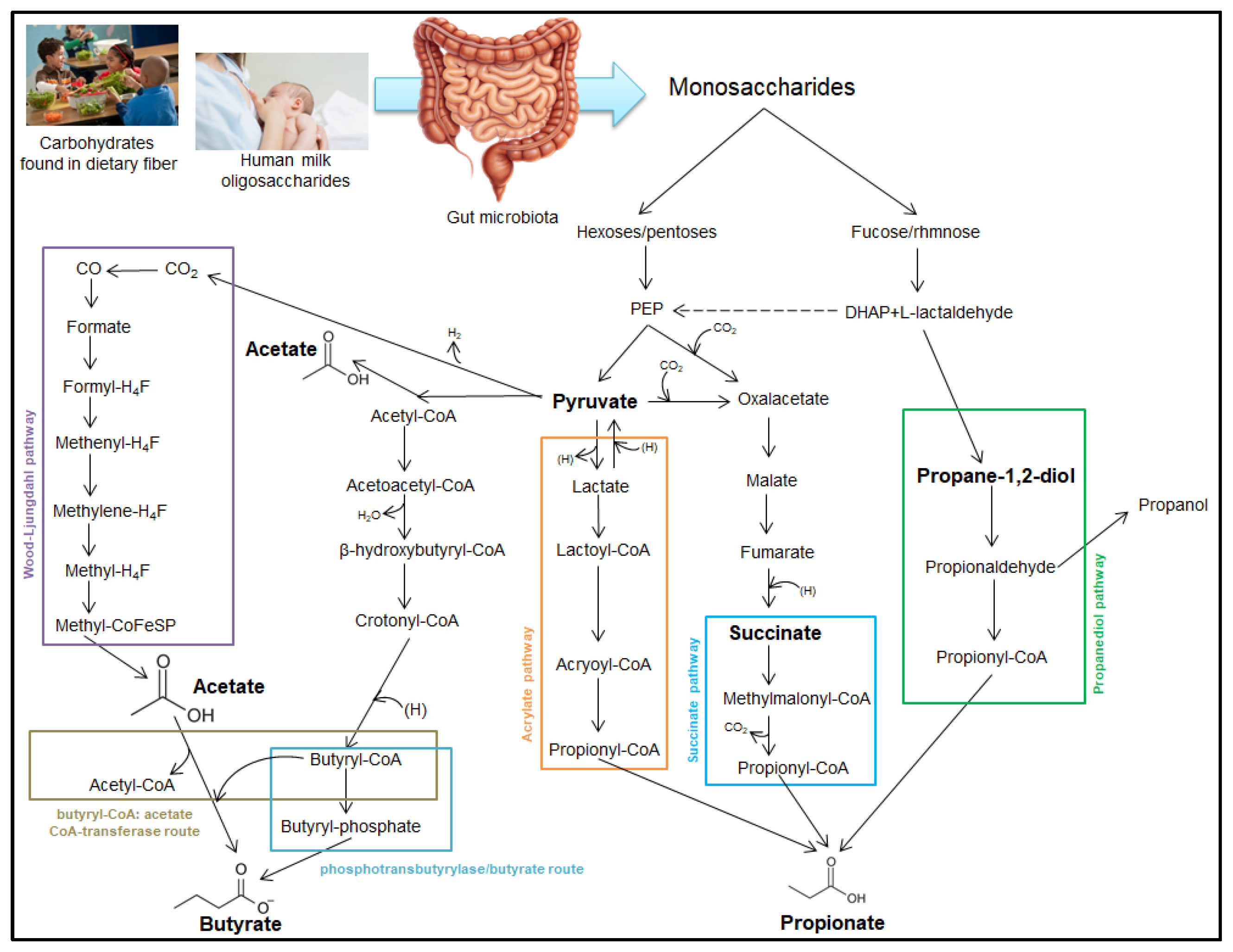 Figure 1. Production of short-chain fatty acids (SCFAs). Phosphoenolpyruvate—PEP; dihydroxyacetone phosphate—DHAP; coenzyme A—CoA; tetrahydrofolate—H4F.