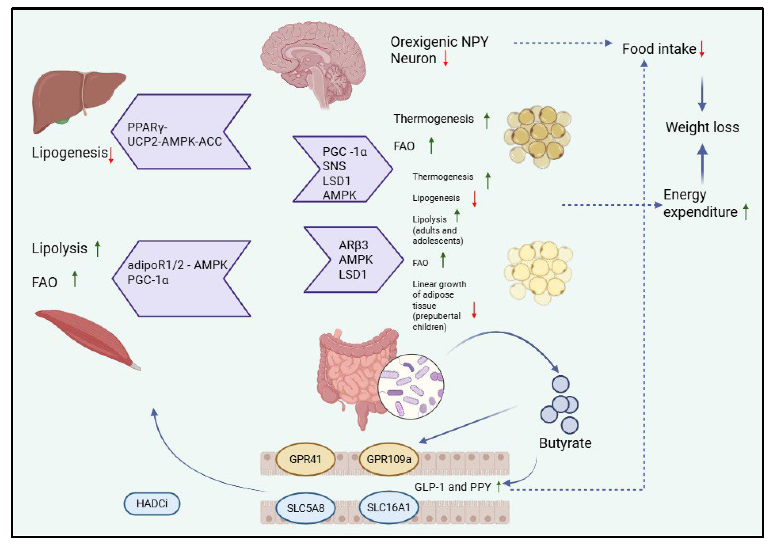 Figure 2. Physiological pathways of butyrate that lead to decreased food intake and increased energy expenditure, through the influence of the brain, liver, striated muscle, and white or brown adipose tissue. Peroxisome proliferator-activated receptor gamma—PPARγ; uncoupling protein 2-AMP-activated protein kinase-acetyl-CoA carboxylase—UCP2-AMPK-ACC; adiponectin receptor 1 and 2—adipoR1/2; peroxisome proliferator-activated receptor gamma coactivator 1-alpha—PGC-1α; fatty acid oxidation—FAO; sympathetic nervous system—SNS; lysine-specific demethylase 1—LSD1; AMP-activated protein kinase—AMPK-ACC; histone deacetylase inhibitors—HADCi; adrenergic receptor Beta 3—ARβ3; G-protein receptor 41—GPR41; G-protein-receptor 109 A- GPR109a; solute carrier family 5-associated 8—SLC5A8; solute carrier family 16-associated 1—SLC16A1.