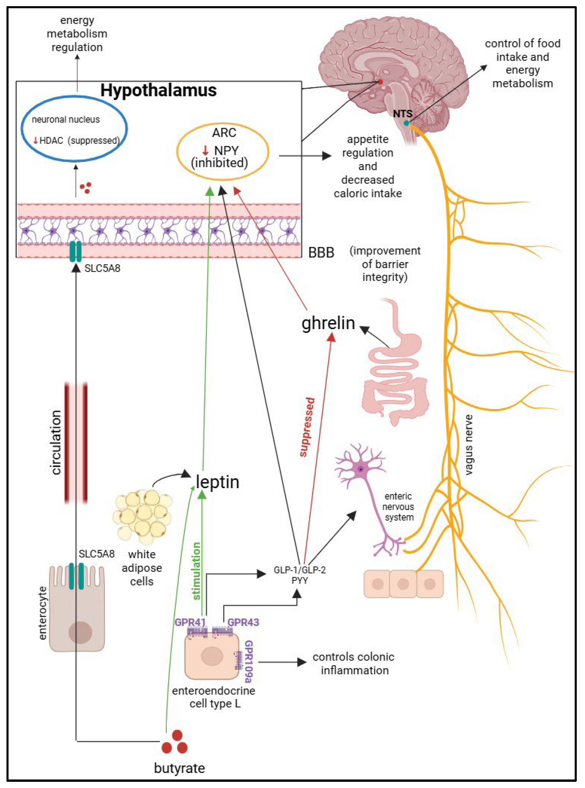 SFCAs act on G-protein coupled receptors (GPCRs), which are represented by GPR41 (FFAR3—free fatty acid receptors 3), GPR43 (FFAR2—free fatty acid receptors 2), and GPR109a (HCAR2—hydroxy-carboxylic acid receptor 2). These receptors are responsible for the actions of butyrate in the body and are found in a wide variety of cells. GPR41 is expressed on adipose cells, peripheral nerves, pancreatic -β cells, enteroendocrine L and K cells, and thymus cells. GPR43 is also found on enterocytes, adipocytes, pancreatic-β cells, enteroendocrine L cells, and some cells of the immune system. Butyrate stimulates GPR41 and GPR43, which will induce the secretion of GLP-1/GLP-2 and PYY; they will interact with the enteric nervous system that will stimulate the vagus nerve and activate the nucleus of tractus solitarius (NTS), which is responsible for regulating eating behavior and energy metabolism. Leptin and ghrelin are two hormones with antagonistic functions involved in the regulation of appetite and satiety. Leptin has the role of reducing the feeling of hunger, and ghrelin to increase it. Leptin is produced by white adipocytes, and ghrelin is secreted by the digestive system. The GPR41 receptor stimulates the leptin pathway, while the ghrelin pathway is suppressed through the action of butyrate-GLP-1. Leptin and GLP-1 will cross the blood–brain barrier and inhibit neurons that secrete neuropeptide Y (NPY) from the arcuate nucleus (ARC) of the hypothalamus, controlling appetite and decreasing food intake. Butyrate is absorbed into the systemic circulation from enterocyte level through the transporter SCL5A8 (solute carrier family 5 member 8). This transporter is the one that transports butyrate to the BBB. Butyrate has an inhibitory action on HDAC (histone deacetylase), which is an enzyme that modulates cellular epigenetic mechanisms, thus regulating the energy metabolism of the organism. SCFAs improve the integrity of the blood–brain barrier. The mechanism described above is illustrated in Figure 3 [61,65,66,67,68,69,70,71,72,73,74]. Recent studies have shown that the gut microbiota can lead to the formation or stimulation of the production of neurotransmitters such as serotonin, dopamine, and γ-aminobutyric acid (GABA). Butyrate leads to increased production of GABA in the hippocampus, which can indirectly modulate appetite and reduce anxiety-related overeating in obese children. Vagus nerve stimulation could also represent a future therapeutic solution for pediatric obesity, by modulating affective state and eating behavior [75,76].