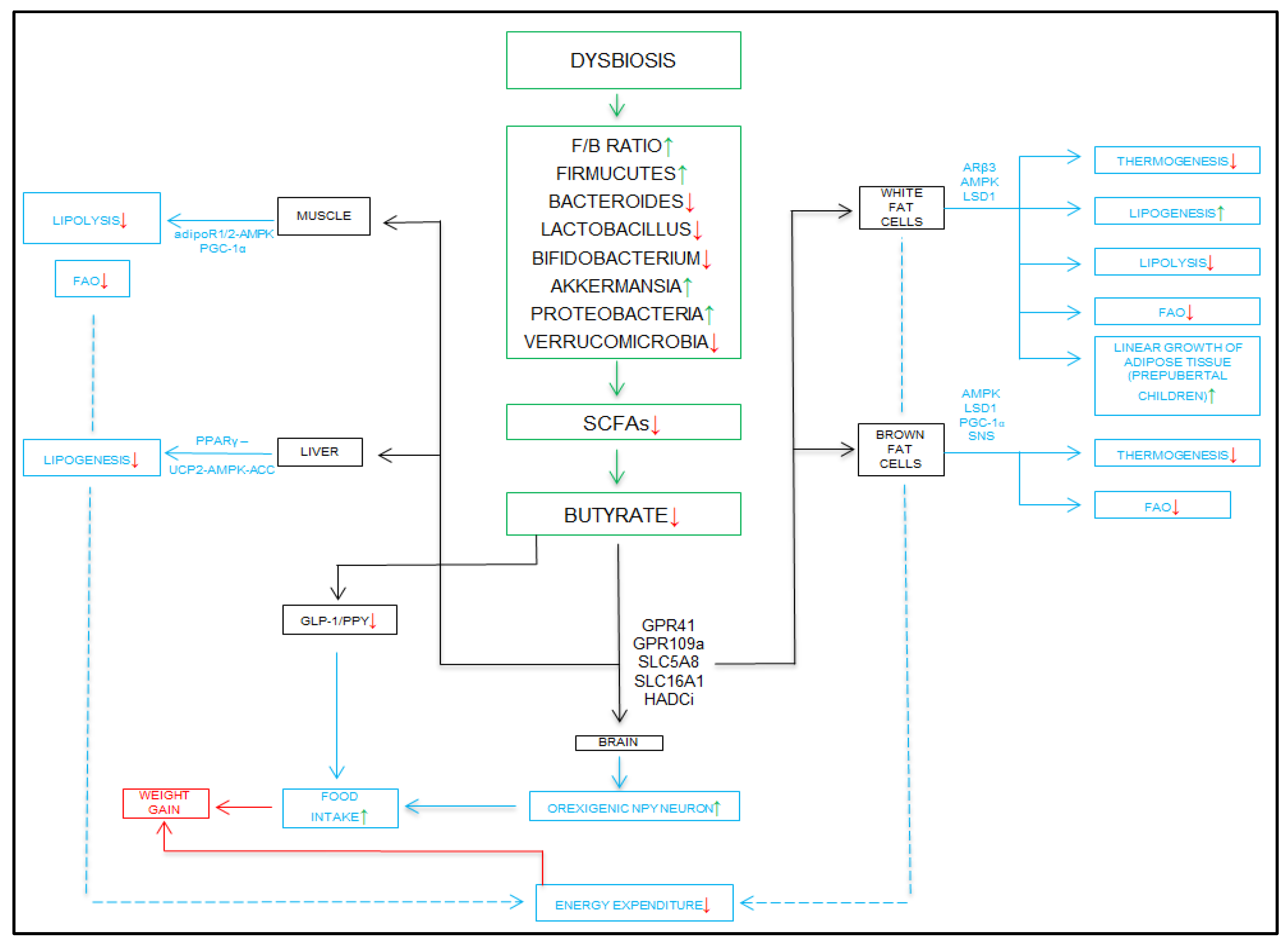 In recent years, the link between the microbiota and its involvement in obesity has been increasingly strengthened, with dysbiosis being the implicated factor in the production and perpetuation of energy imbalances within the body [62]. The emergence of an abnormal microbiota as a structure will also produce deviations in the production of its metabolites, especially SCFAs. Thus these fatty acids will be involved in abnormal weight gain [61,62]. the significant relationship between obesity and the changes that occur at the level of the microbiome and the secretion of SCFAs is strongly illustrated by a large number of studies [91,92,93].