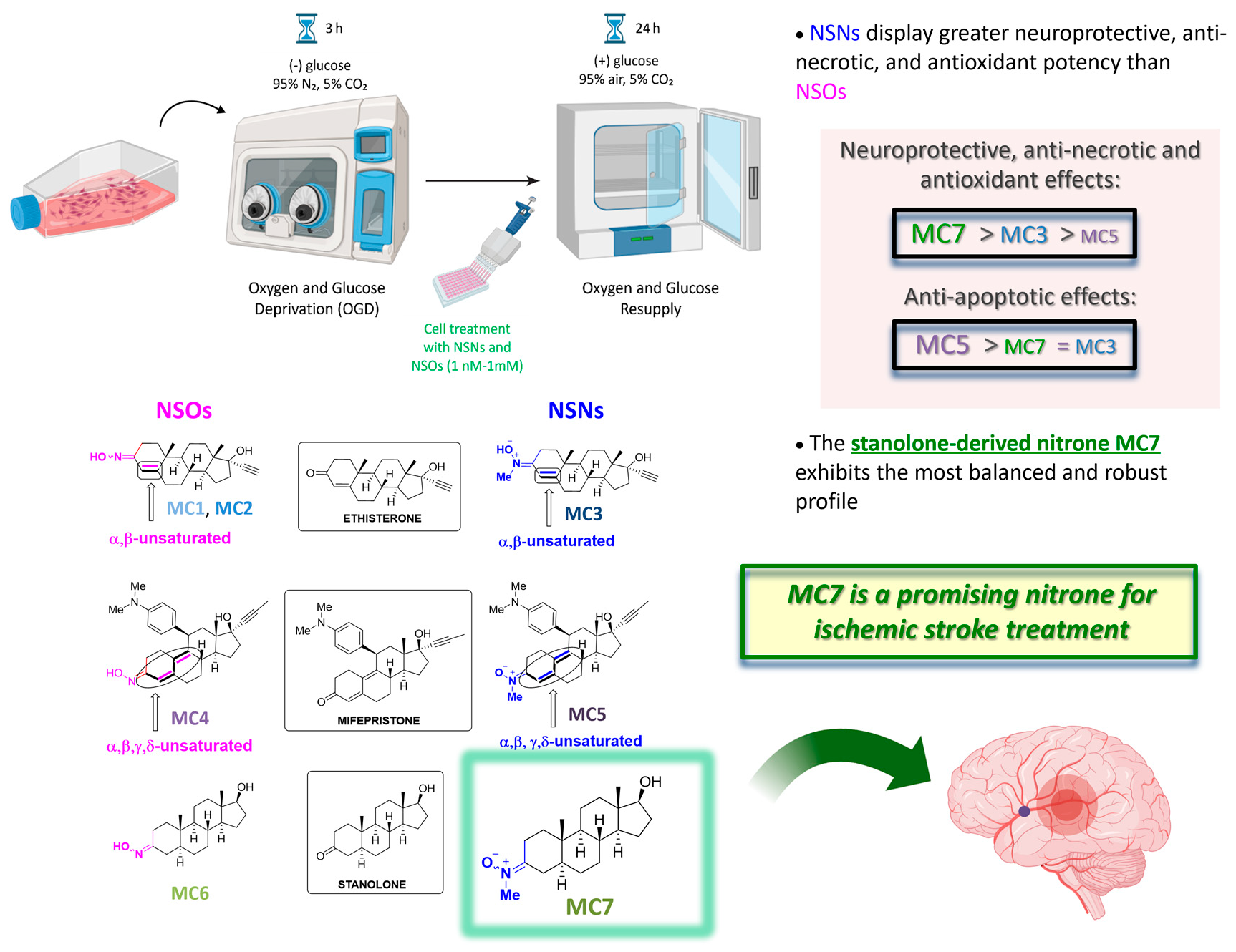 Despite the substantial global impact of ischemic stroke, current therapeutic options remain limited and only partially effective. To advance neuroprotective strategies that could improve the safety and efficacy of existing treatments while preserving brain tissue, we synthesized and evaluated seven new nitrones (MC3, MC5, MC7) and oximes (MC1, MC2, MC4, MC6) derived from different neuroactive steroids—ethisterone (MC1–3), mifepristone (MC4–5) and stanolone (MC6–7)—in an in vitro model of cerebral ischemia. Overall, these derivatives exhibited neuroprotective and antioxidant effects superior to those of the reference compounds cholesteronitrone ChN2, α-tert-butyl nitrone (PBN) and N-acetylcysteine (NAC). Notably, nitrones showed greater neuroprotective, anti-necrotic, and antioxidant potency than their corresponding oximes, regardless of the degree of molecular conjugation. Among them, the stanolone-derived nitrone MC7, which lacks conjugated double bonds, displayed the most balanced and robust profile, consistently enhancing cell viability, reducing necrotic cell death, and suppressing superoxide anion production. Consequently, MC7 has been selected as a promising lead compound for further in vivo studies of cerebral ischemia.